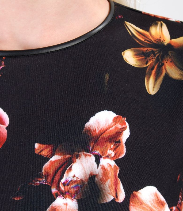 Thick elastic jersey dress with digital print, with round neckline and fallen shoulders. Middle-back concealed zip fastening.