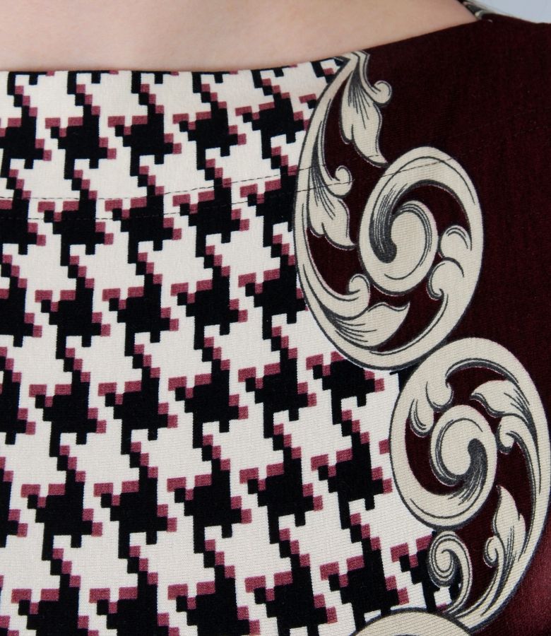 Comfortable elastic jersey dress, with geometric motifs, slightly flared, with cleavage at the neck line. Has no locking system.