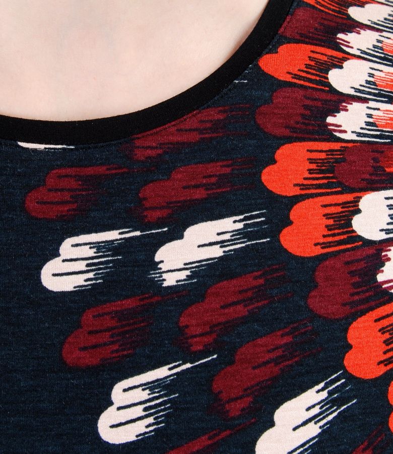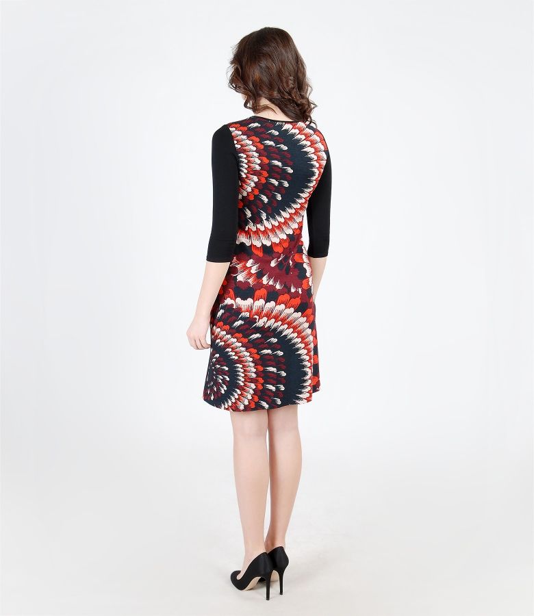 Printed elastic jersey dress with lining, slightly flaring, with round neckline and 3/4 sleeves. No closing sistem. Print position varies per product.