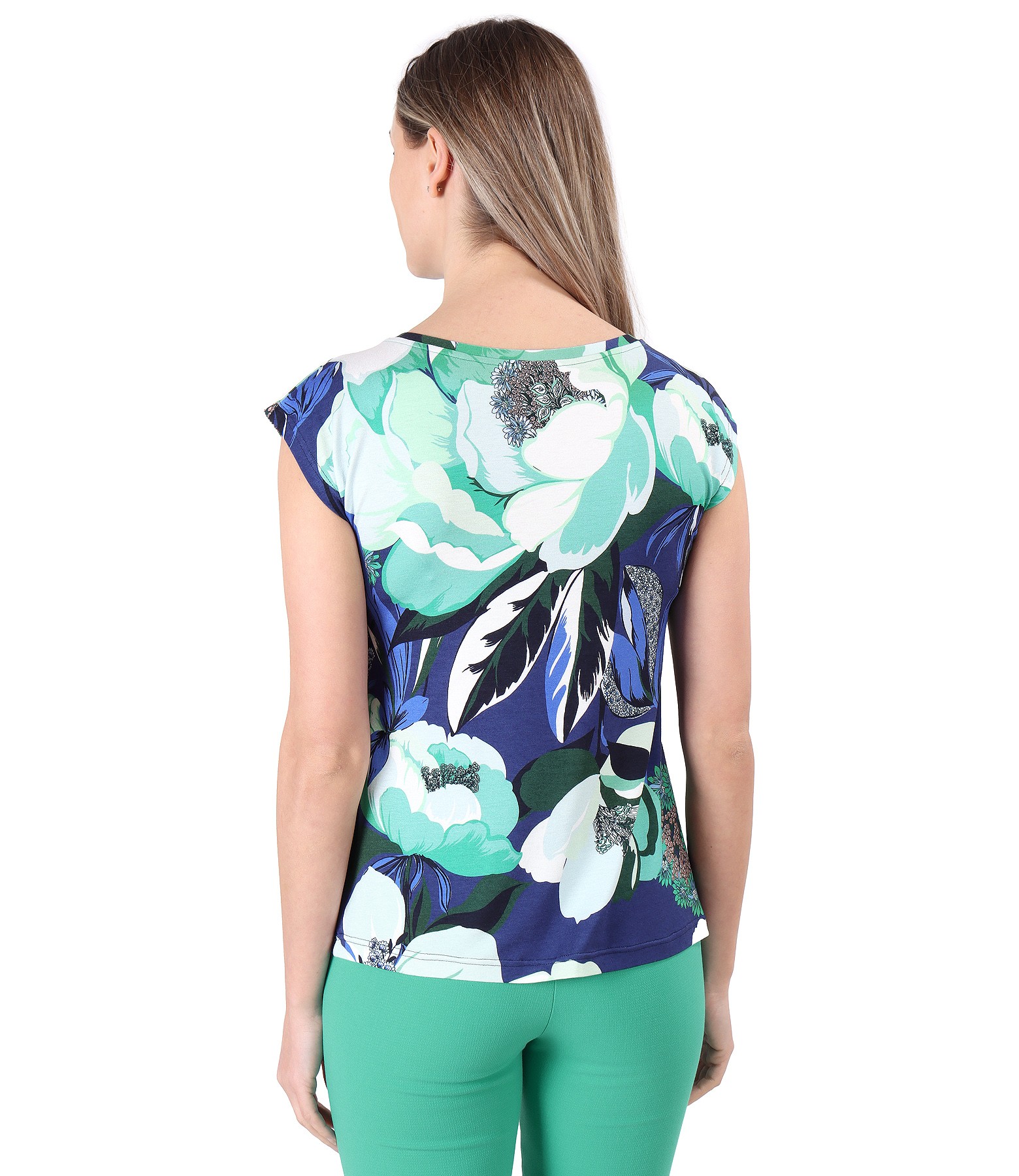Blouse made of elastic jersey printed with floral motifs,boat neckline and dropped shoulders. Pozitia imprimeului variaza per produse.