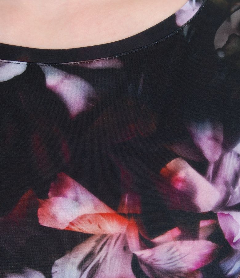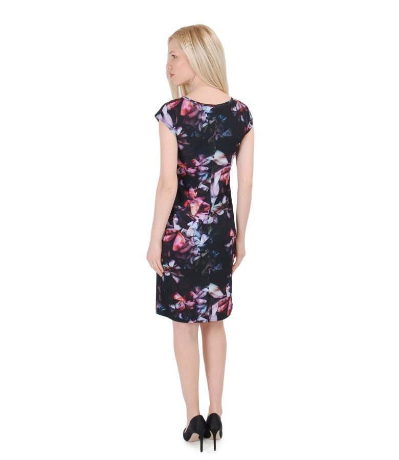 Printed elastic jersey dress without lining, with fallen shoulders and slightly flaring line, cut on middle back. No closing system.