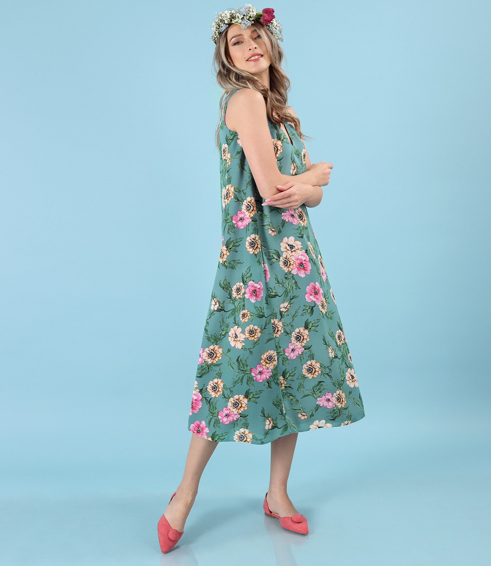 Printed midi dress with floral motifs (Turquoise), size