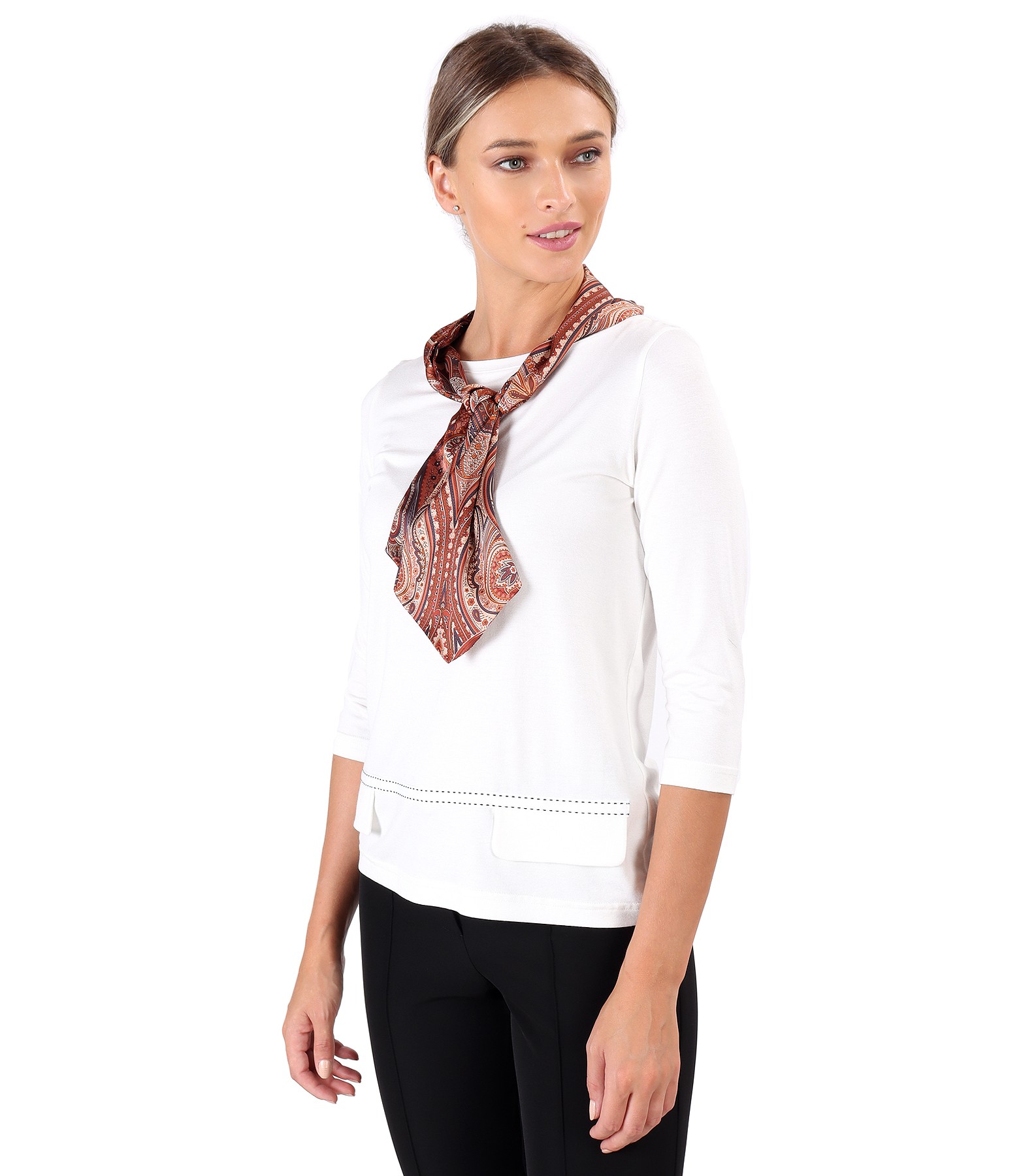 Printed satin scarf, doubled, rectangular in shape, with sharp ends.