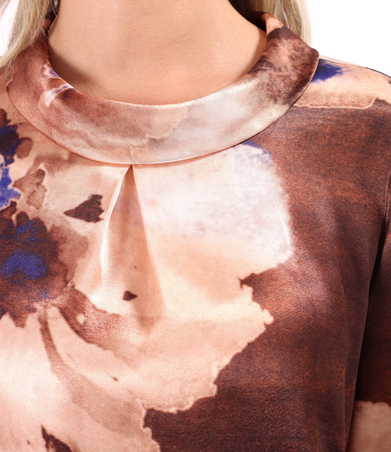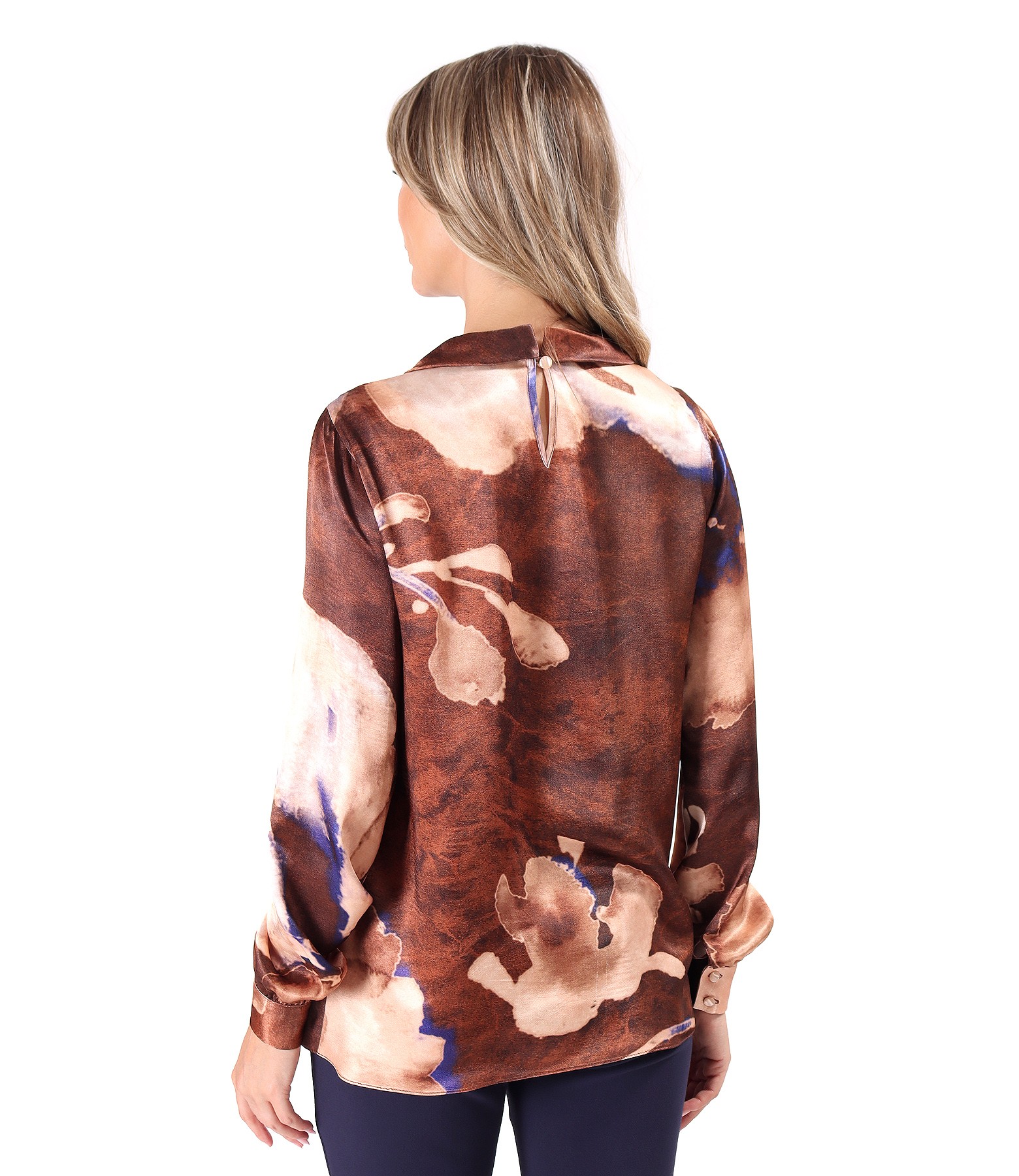 Satin viscose blouse printed with oversized flowers, long gathered sleeves with cuffs of the same material with 2 buttons, with a pleat on the center front, and a round collar. Fastens with a button on the center back. The position of the print varies per product.