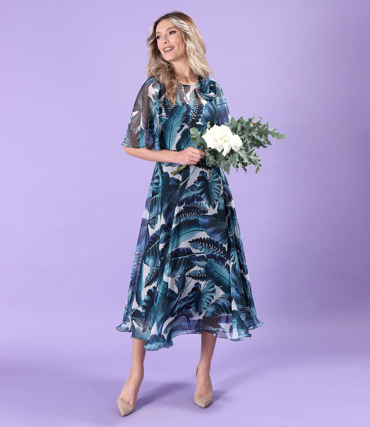 Midi dress made of soft veil printed with floral motifs, with wide veil sleeves, doubled with viscose, and with a round neckline with a removable handmade flower. It closes with a hidden zipper in the middle of the back.