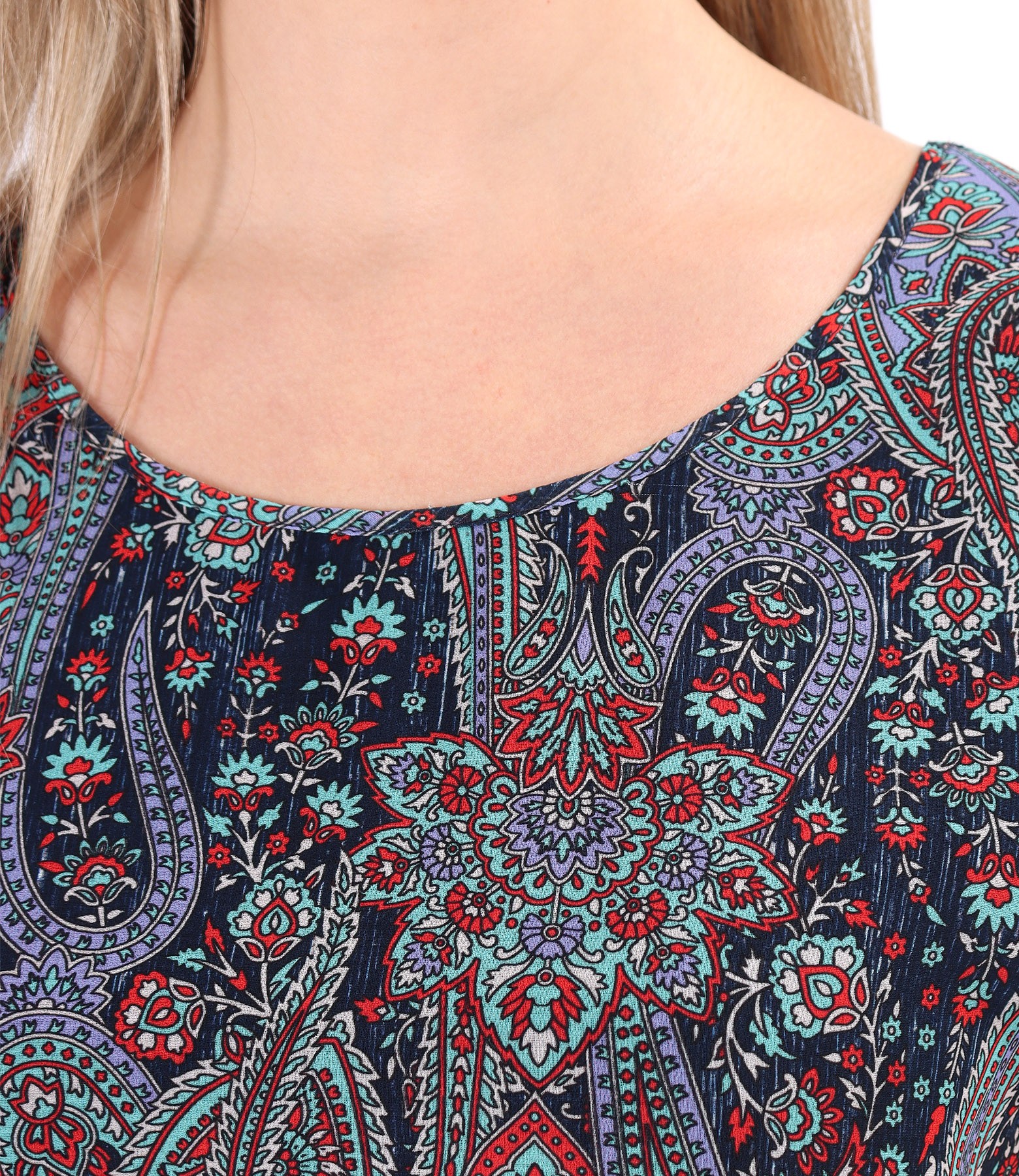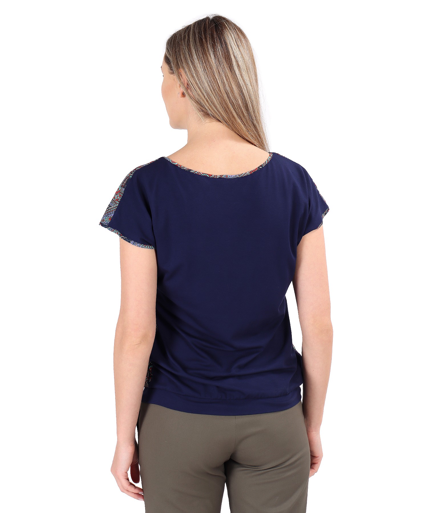 Elastic jersey blouse, with front made of printed veil, doubled with viscose, round neckline, and dropped sleeves.
