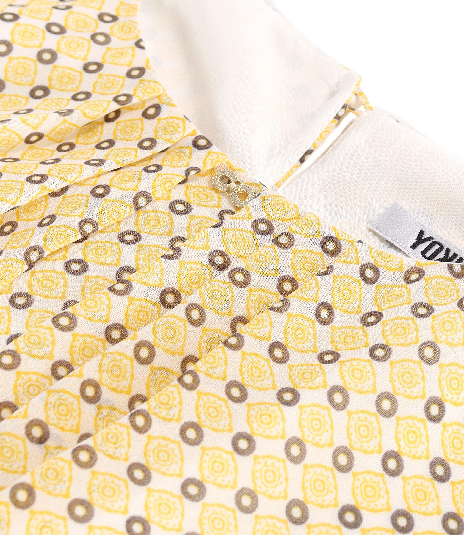 Printed veil blouse with geometric motifs, doubled with viscose, with pleats at the neckline and with 3/4 sleeves. It closes with a button on the middle back.