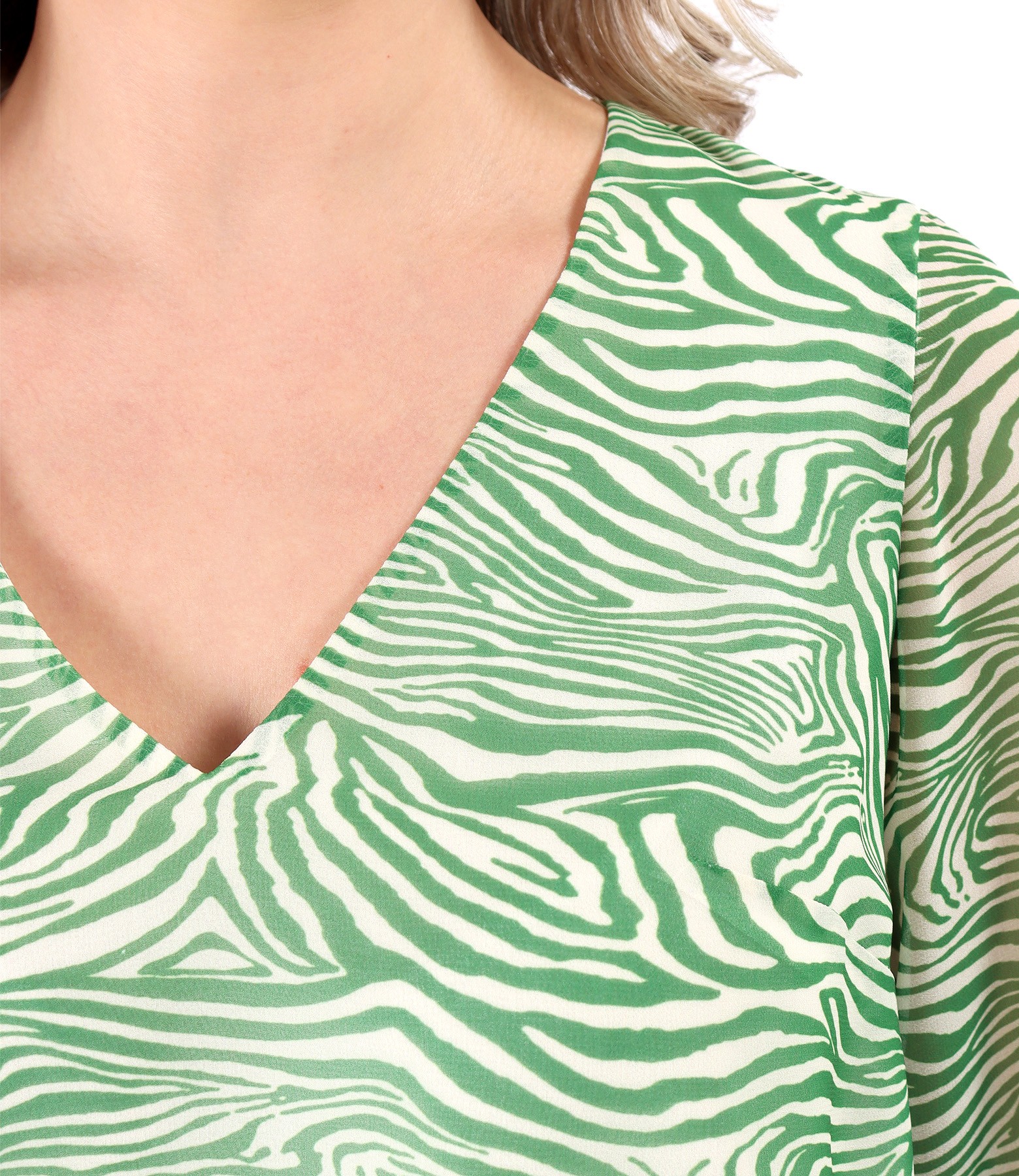 Printed veil blouse with geometric motifs, padded with viscose, V-neckline, and long sleeves wrinkled at the end.