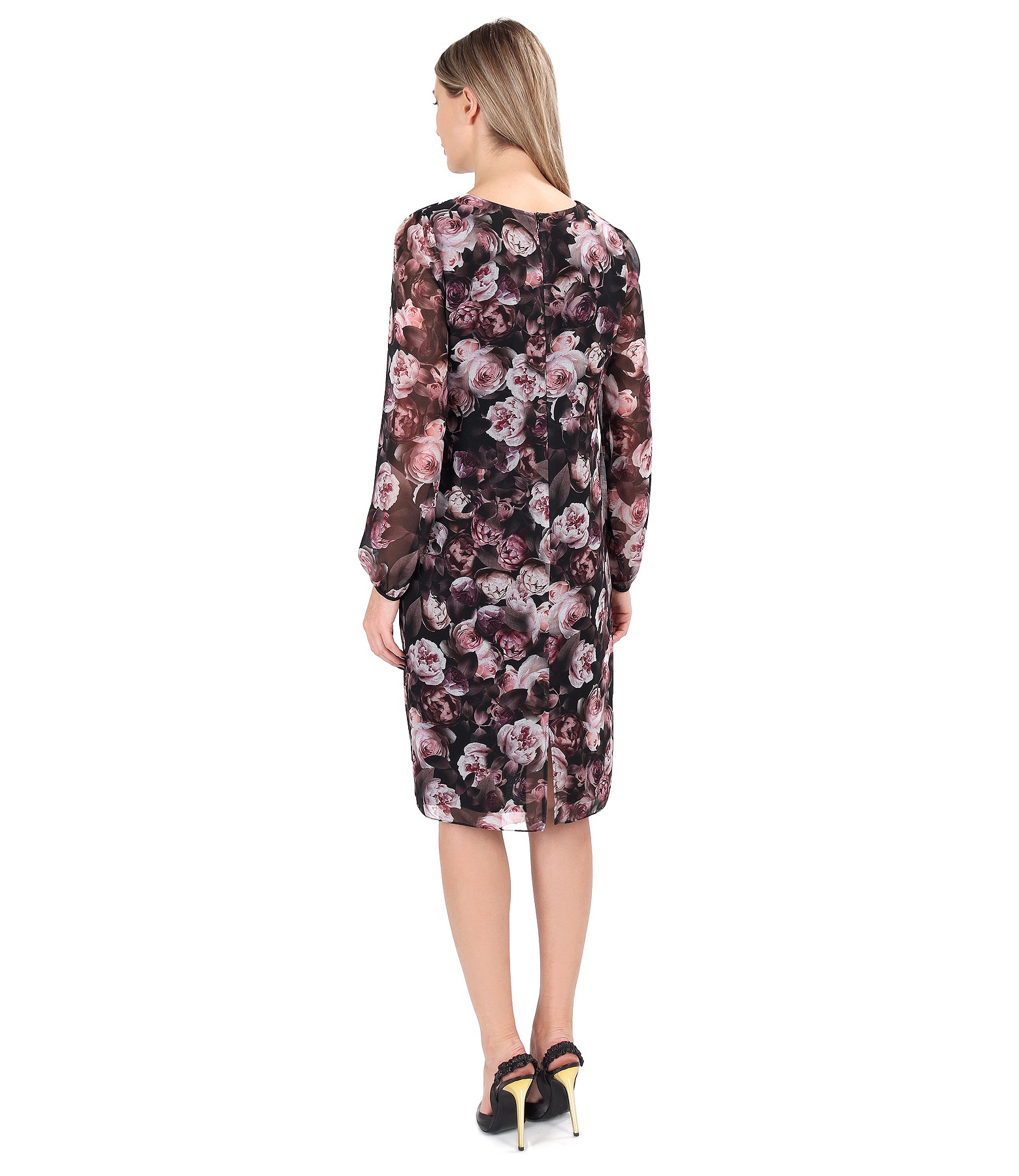 Printed veil dress with floral motifs, padded with viscose, with long sleeves and round neckline. It closes with a hidden zipper on the middle back.