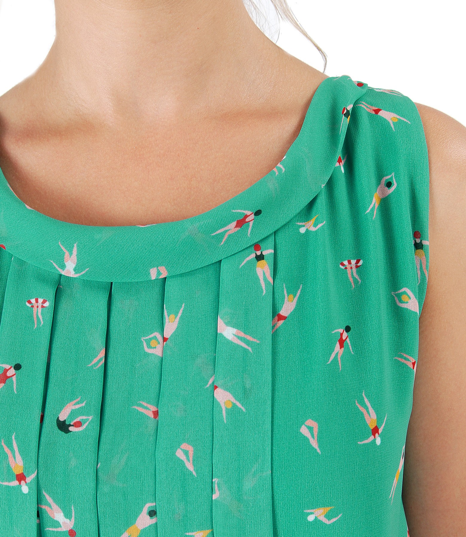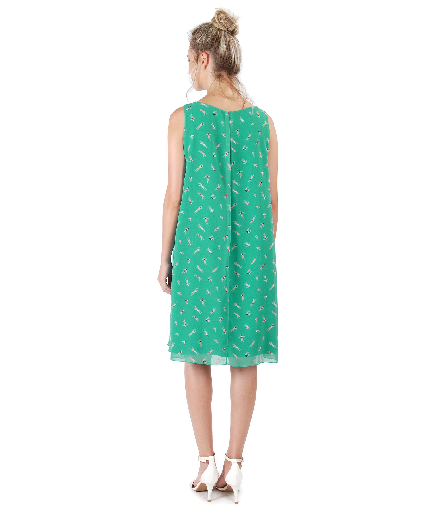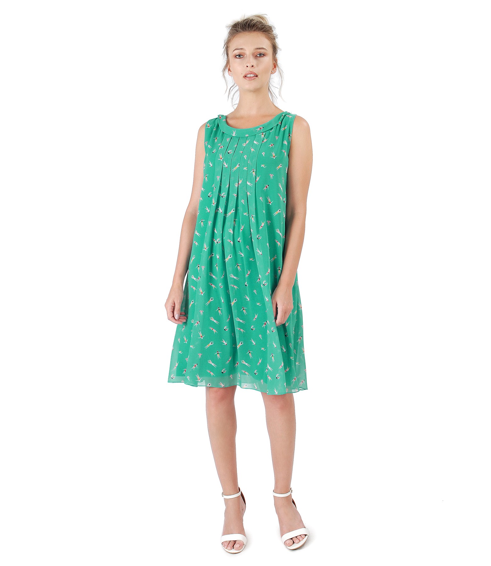 Casual veil dress, doubled with viscose, without sleeves, with front folds and trim on the low-cut neck.