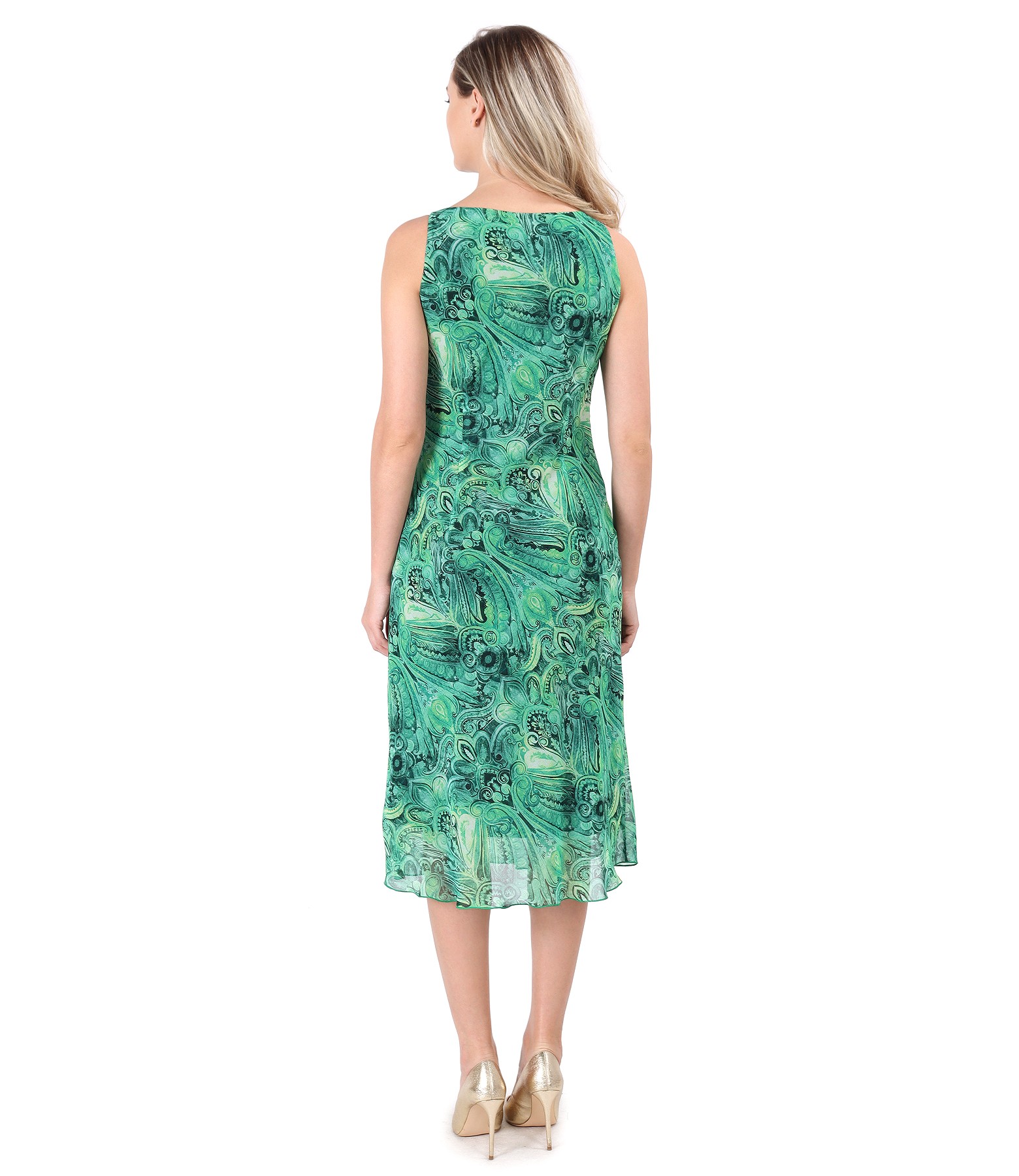 Printed veil dress with floral motifs,doubled with viscose,without sleeves and with a neckline in folds.Without closing system.