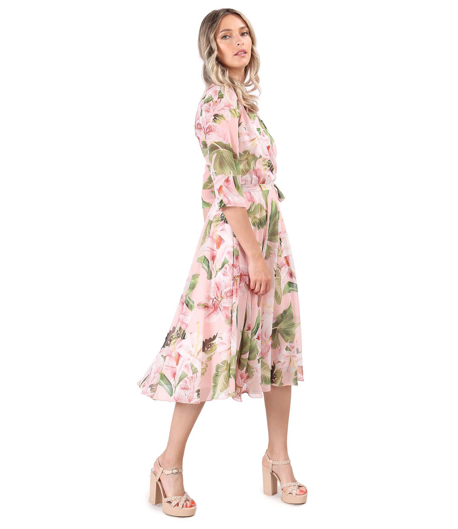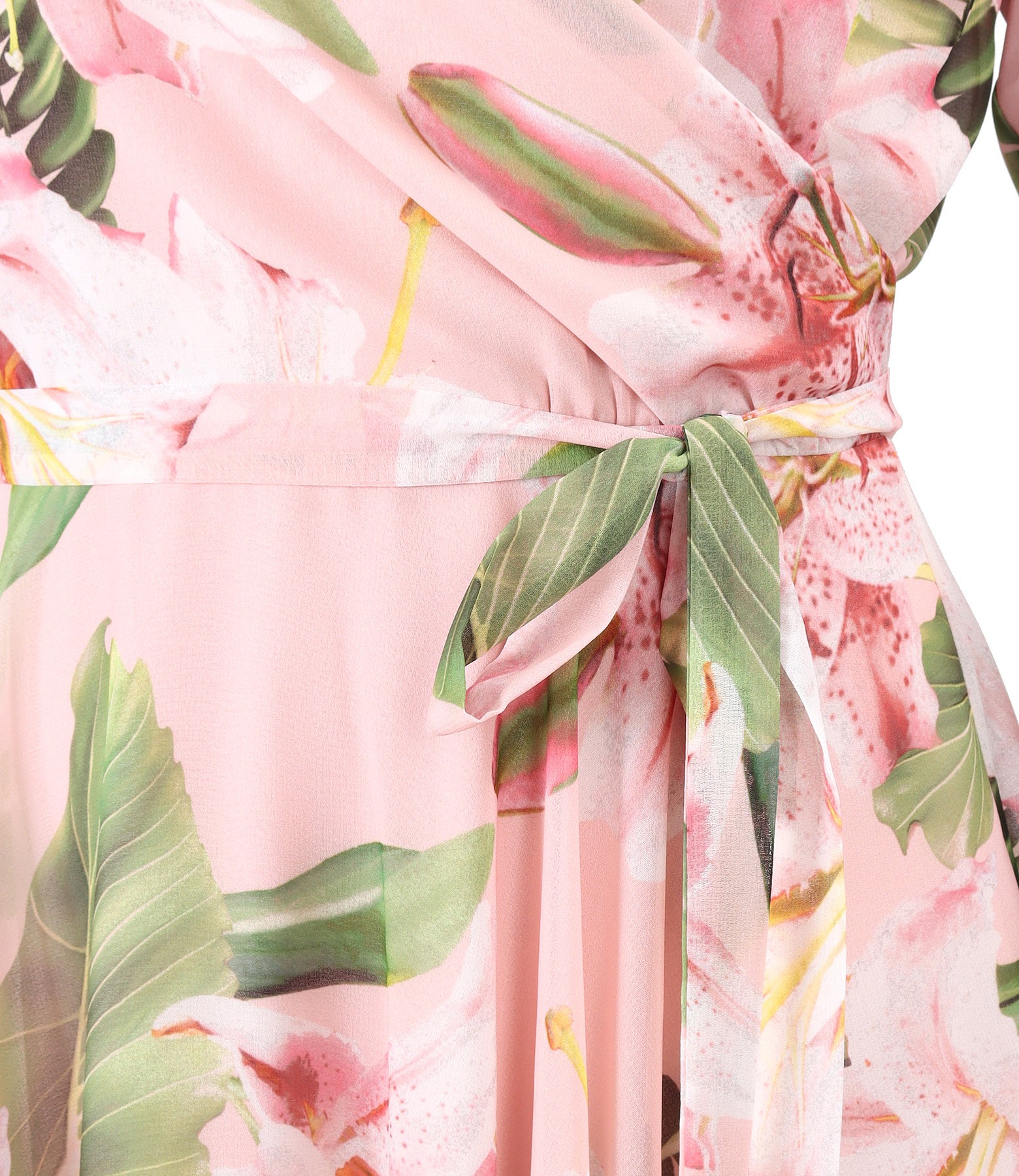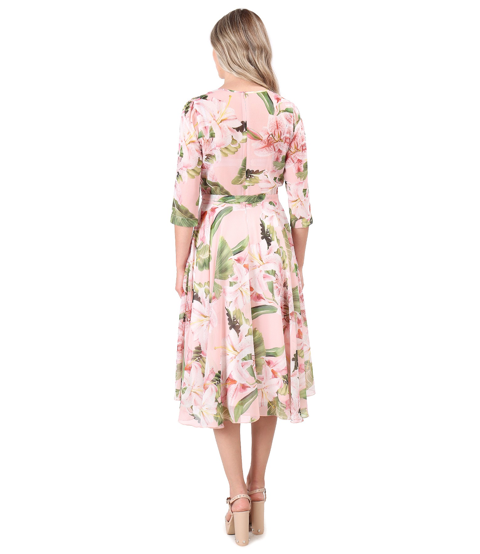Oversized floral printed veil dress, padded with viscose, drawstring waist, 3/4 sleeves, and ruched pleats. Closes with a concealed zipper at the middle back. At XL-3XL sizes, the back is doubled.