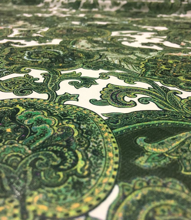 Evening dress made of veil with floral print, padded with viscose, 3/4 sleeves and waist belt. Closes with hidden zipper on the middle back.