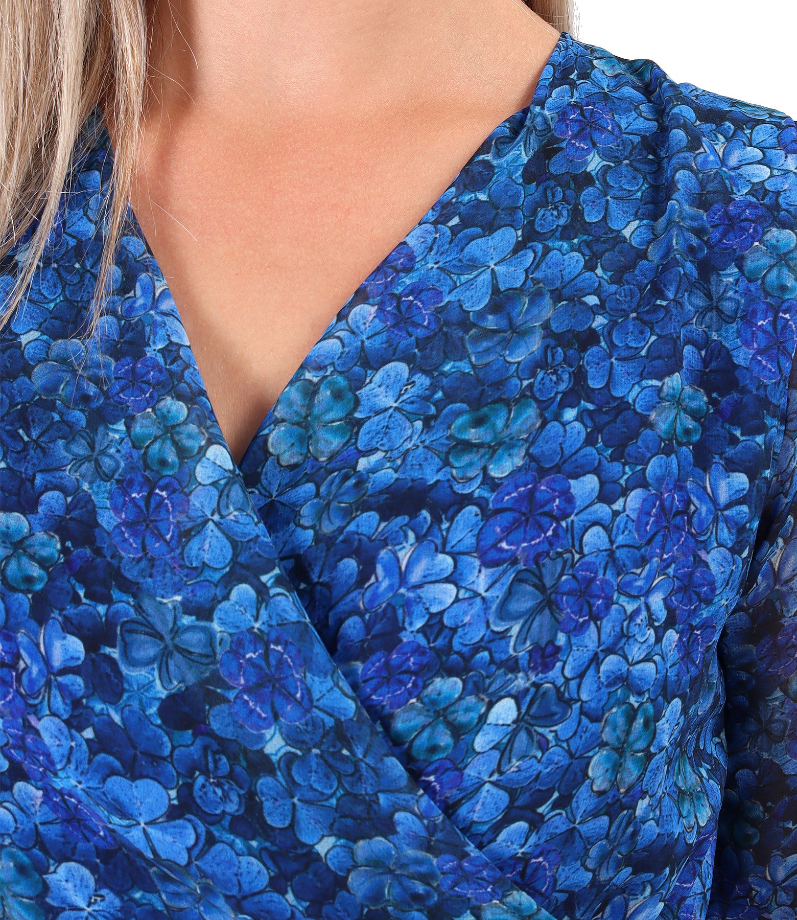 Printed veil dress with floral motifs, lined with viscose, with 3/4 sleeves and spent breast. It closes with a zipper hidden in the middle of the back, and a velvet waist cord with a velvet bow. At XL-3XL sizes, the back is doubled.