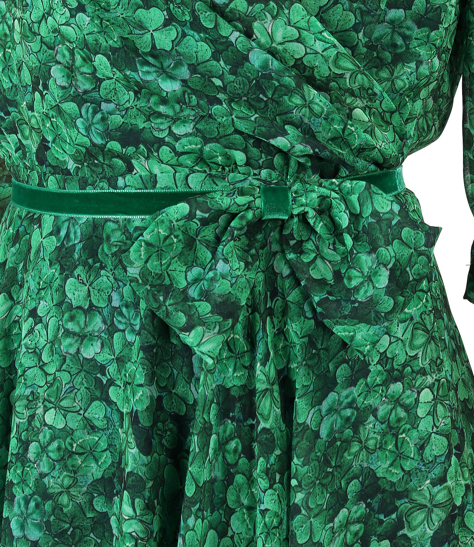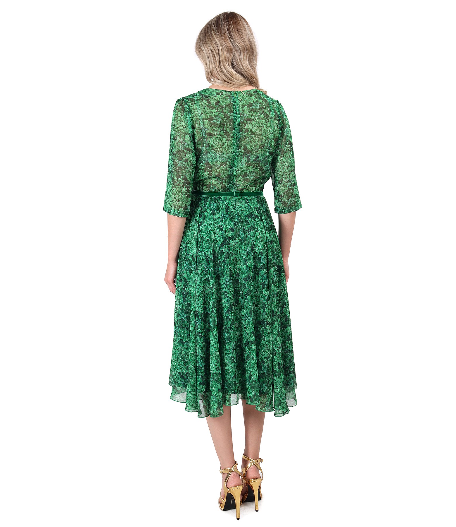 Printed veil dress with floral motifs, lined with viscose, with 3/4 sleeves and spent breast. It closes with a zipper hidden in the middle of the back, and a velvet waist cord with a velvet bow. At XL-3XL sizes, the back is doubled.