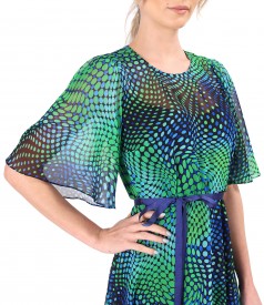 Printed veil midi dress with wide sleeves, padded with viscose, and with a round neckline and a drawstring at the waist. It closes with a hidden zipper in the middle of the back.