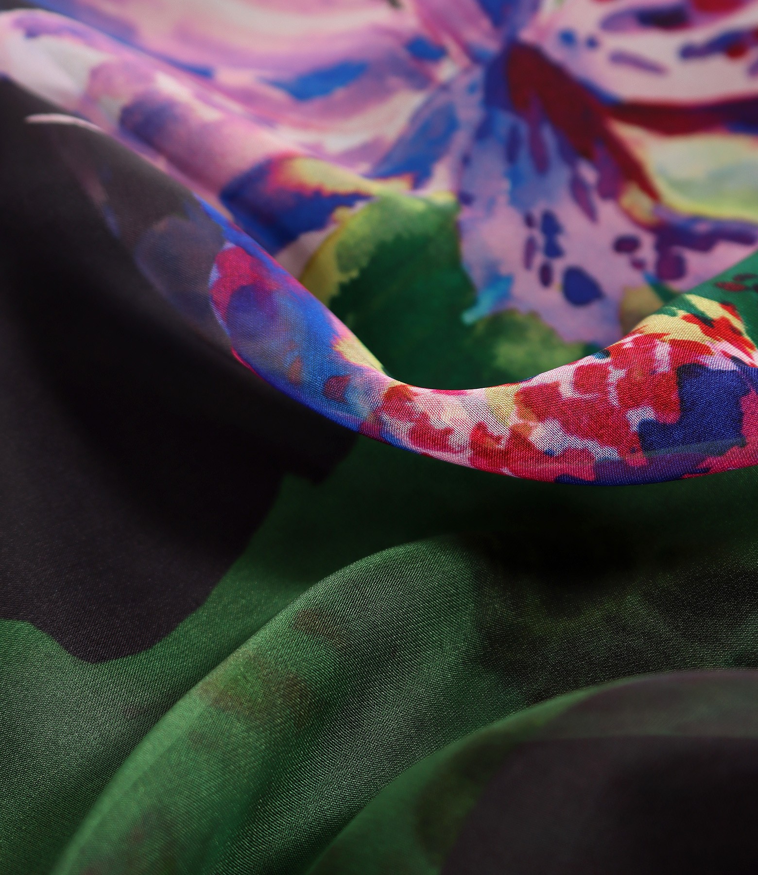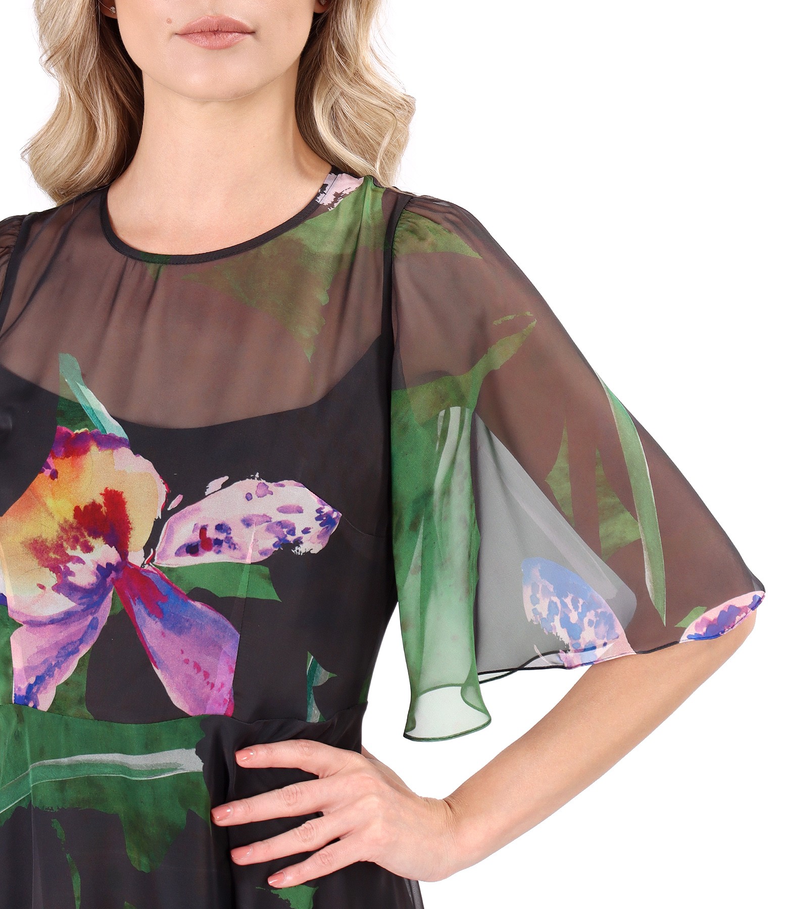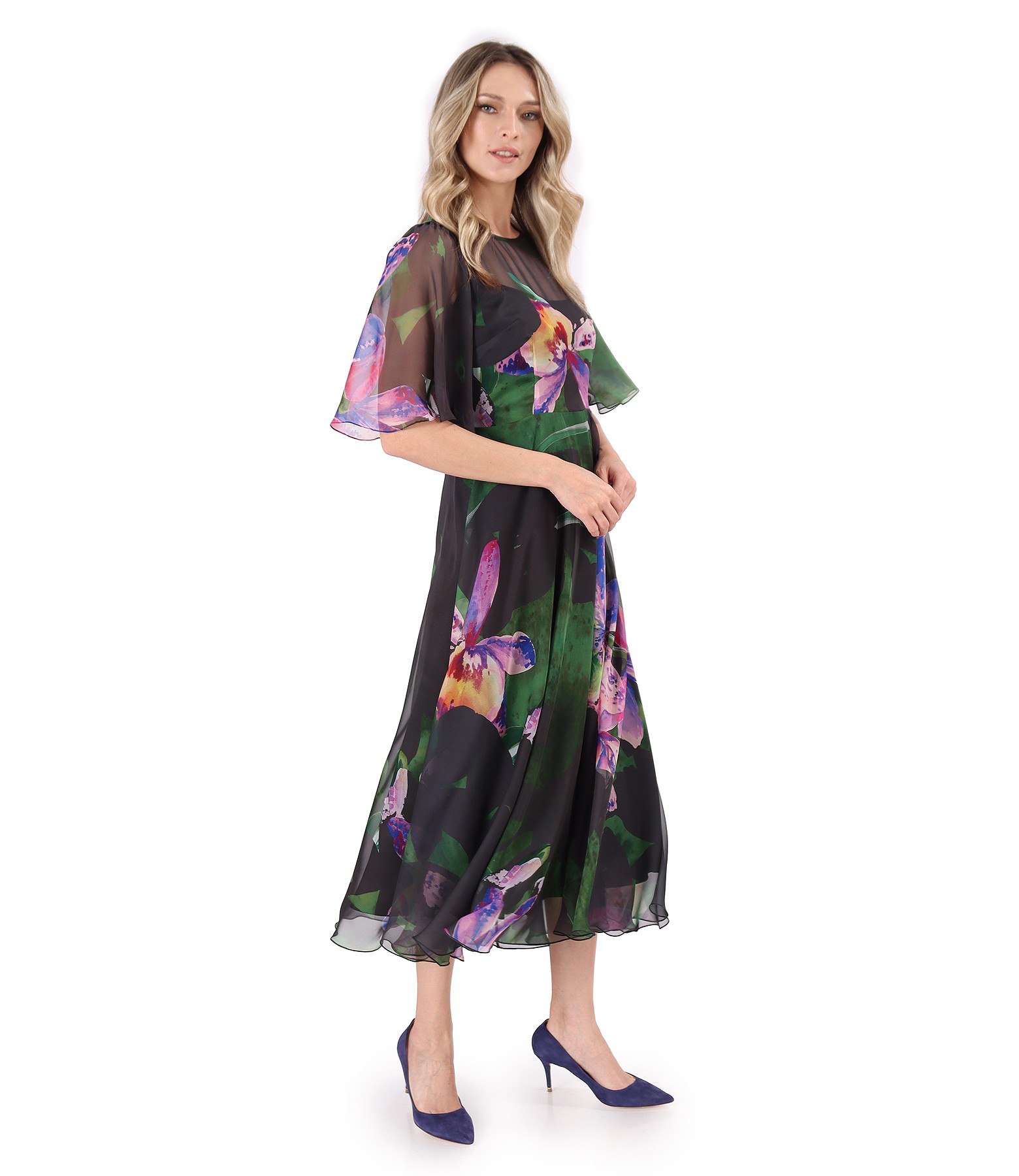 Veil midi dress printed with floral motifs, with veil wide sleeves, doubled with viscose, and round decolletage. It closes with a hidden zipper on the middle back. The position of the print varies per product.