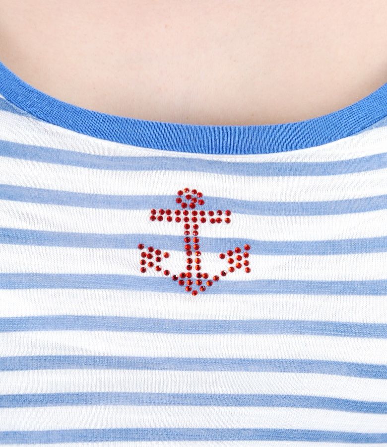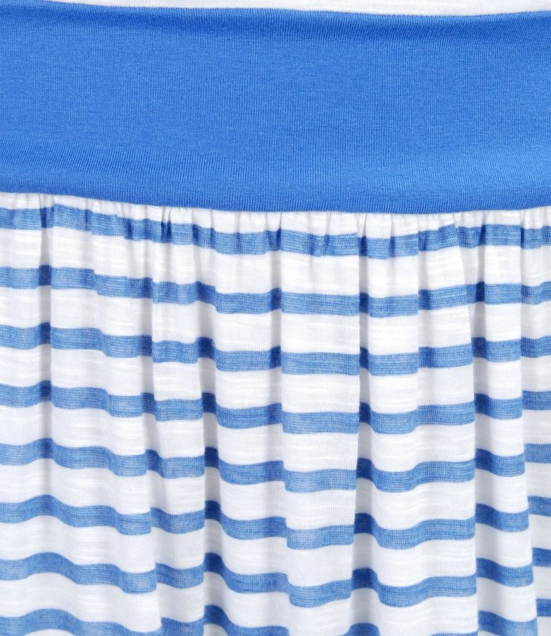 Elastic jersey dress from soft printed viscose with straps, doubled with white viscose jersey. Round neckline front and back, flared skirt and crystals aplication on front. No closing system.
