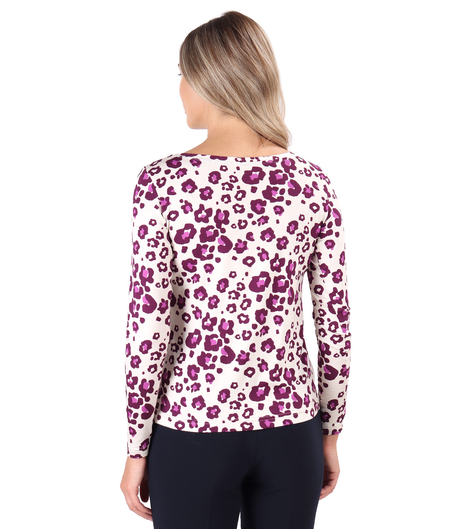 Printed viscose elastic jersey blouse with round decolletage and long sleeves.