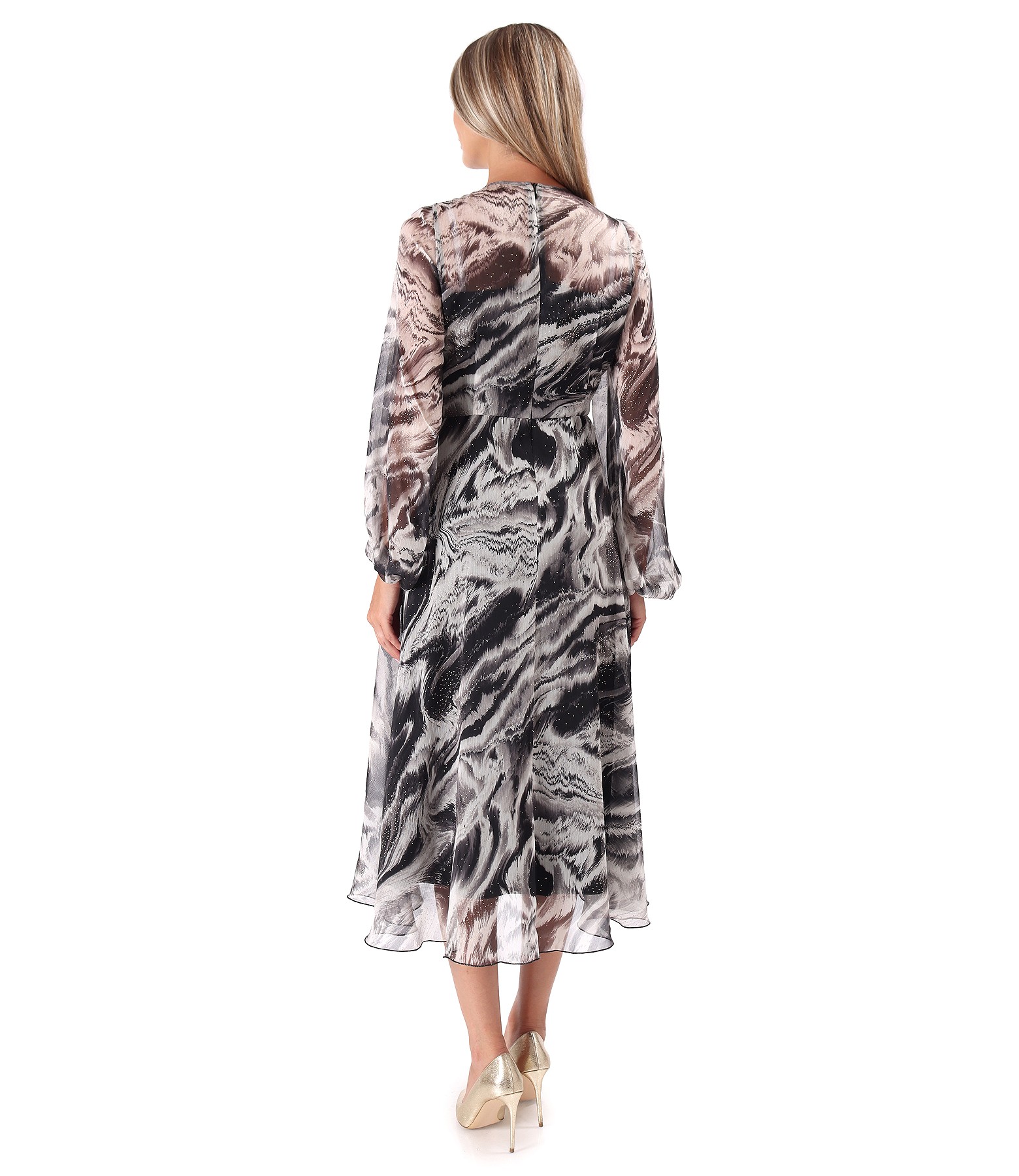 Midi dress in printed voile with a grosgrain band adorned with crystals at the waist, lined with viscose, featuring long, wide sleeves gathered at the cuffs and a round neckline. It fastens with a concealed zipper at the center back.