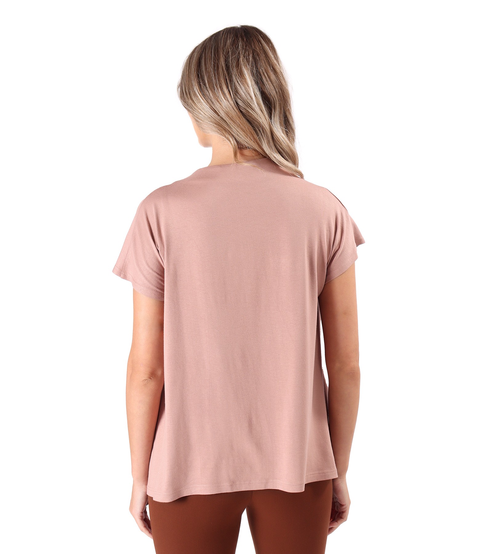 Loose-fitting blouse with pleats on the left shoulder, made from elastic jersey, featuring dropped short sleeves.