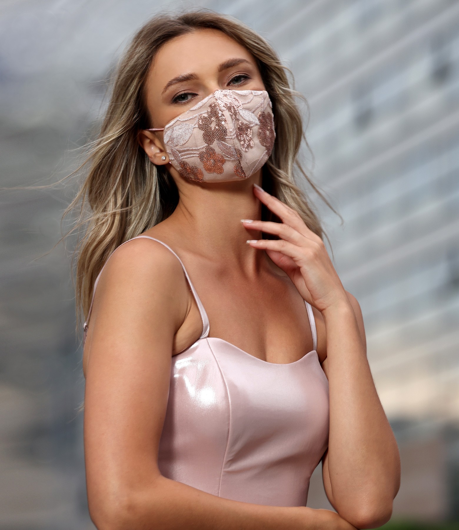 Reusable lace mask with sequins with floral motifs. It is padded with viscose and has elastic grip on the sides.