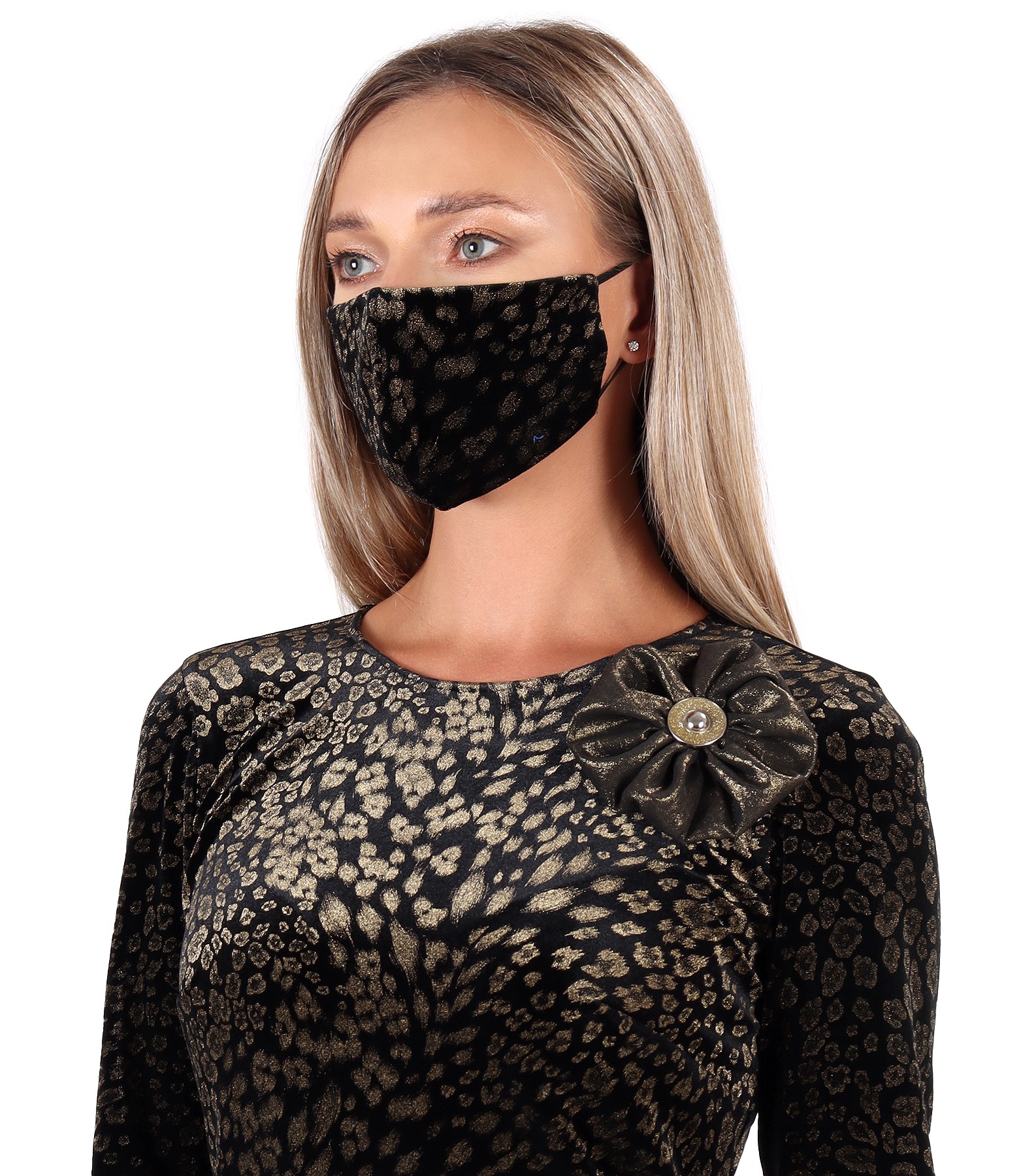 Reusable elastic velvet mask printed with gold motifs. It is padded with viscose and has elastic grip on the sides.