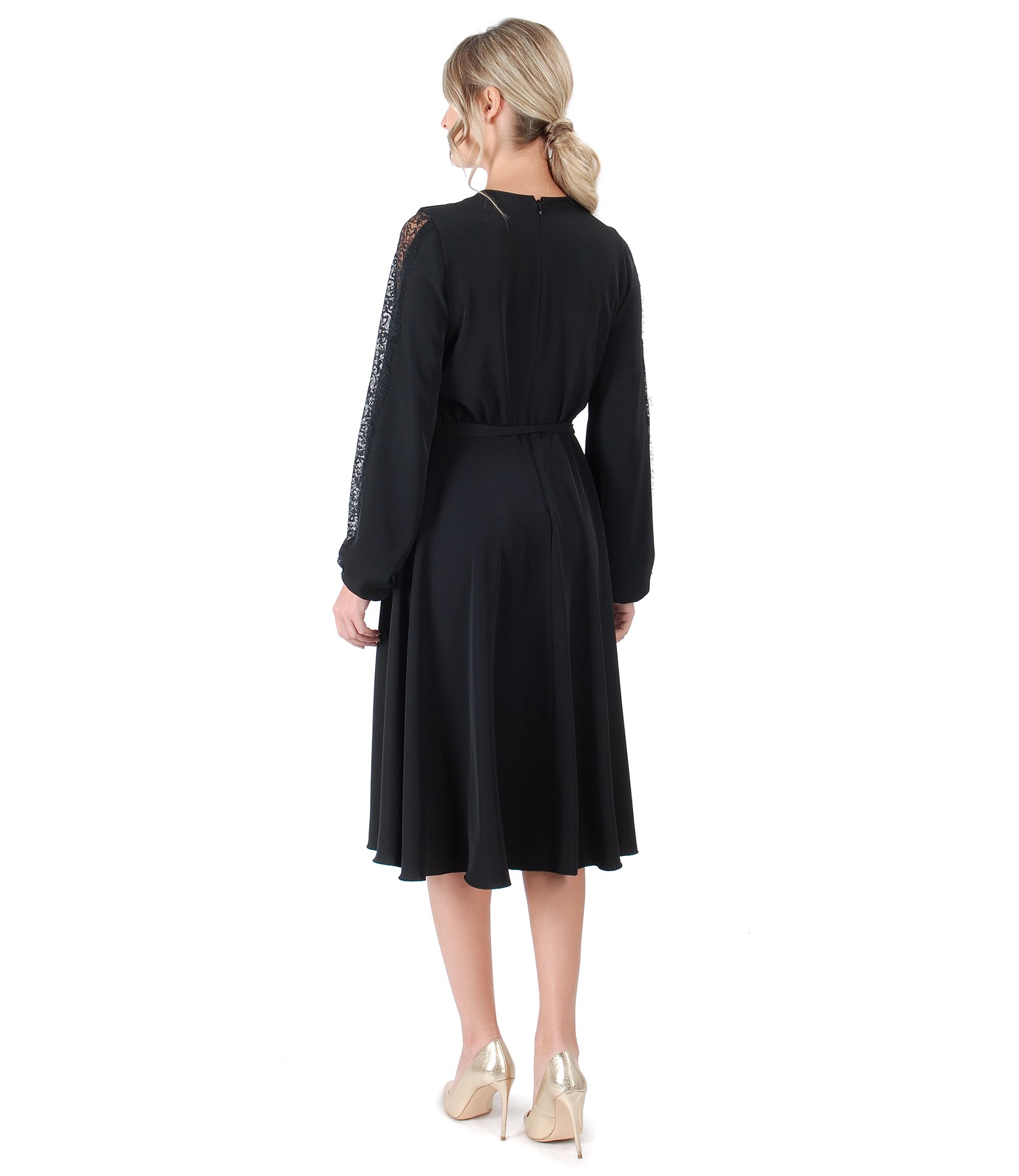 Rochie de seara, captusita, cu maneci lungi cu insertie din dantela pe lateral si cu elastic la terminatie, pieptii petrecuti, cordon si lant in talie. Se inchide cu fermoar ascuns pe mijloc spate.