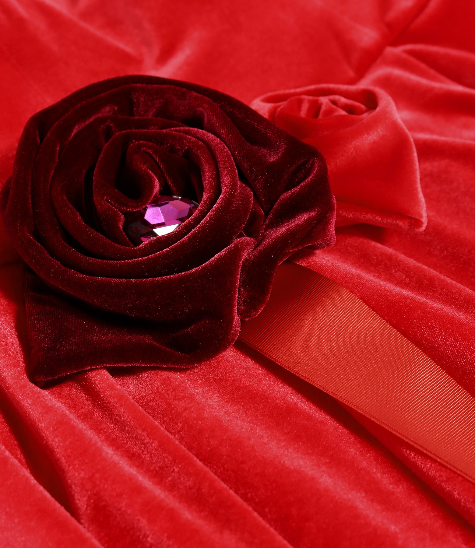Rochie de seara lunga cu corset reglabil din catifea elastica rosie, cu balene, cupe si cu bretele. Este decorata in talie cu brosa detasabila cu flori din catifea, executate manual si este dublata cu saten. Reglabila prin ajustare cu siret pe spate.
