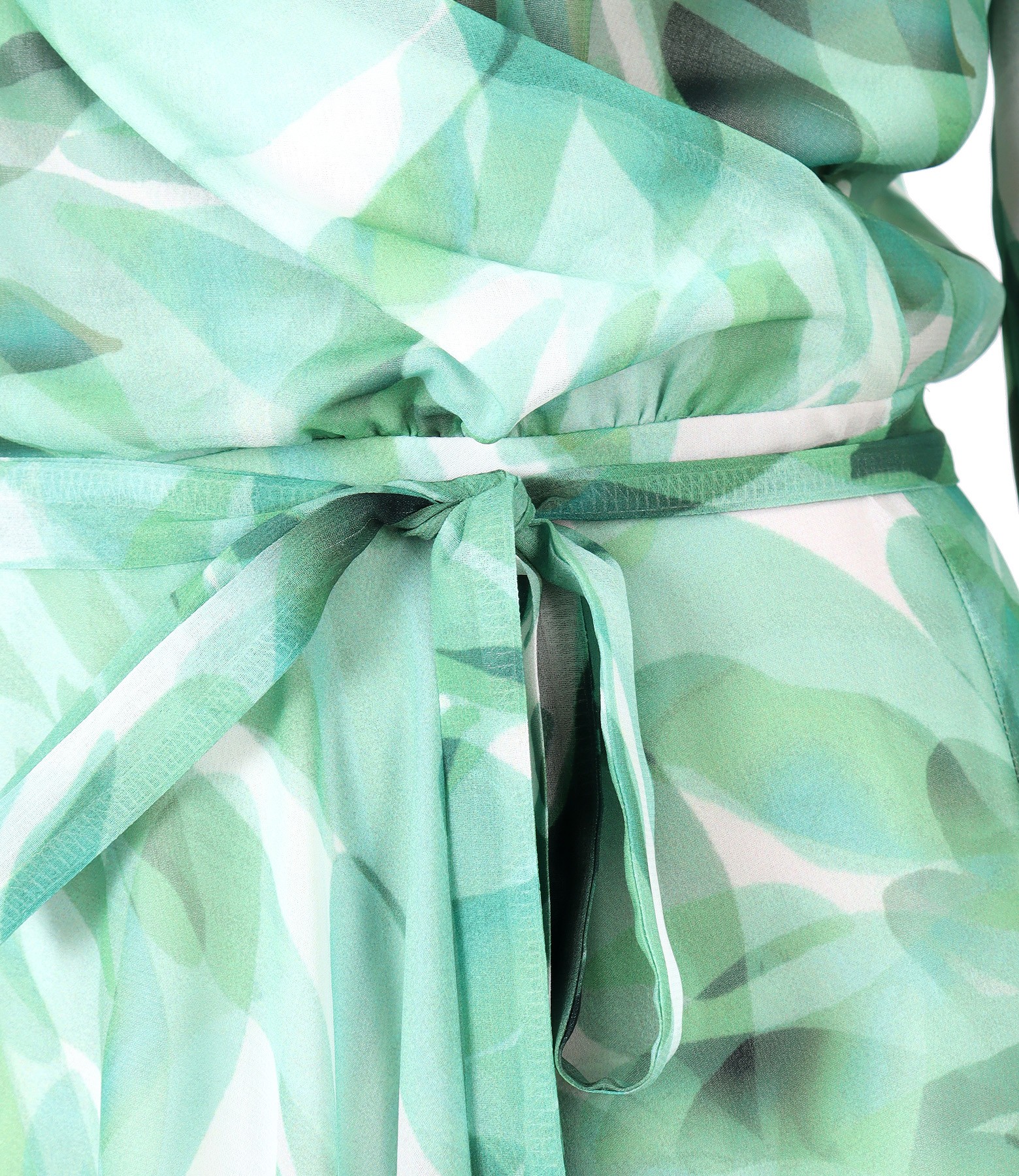 Evening dress made of veil with floral print, padded with viscose, 3/4 sleeves and waist belt. Closes with hidden zipper on the middle back.