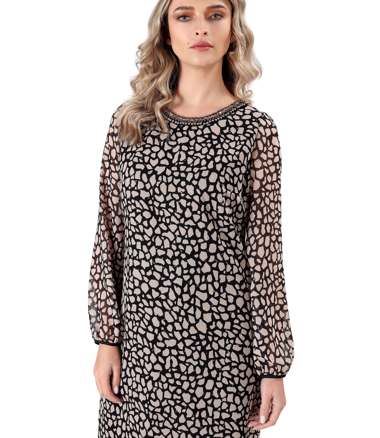 Casual veil dress with animal print,doubled with viscose,with long sleeves and elastic trim and low-cut neck with beads jewel inserts.Close with a hidden zipper on the middle back.