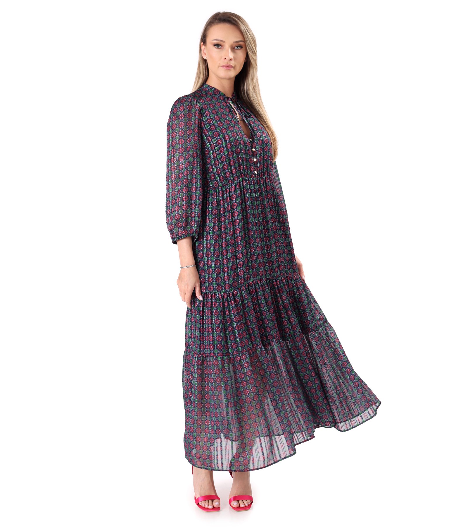 Rochie lunga cu volane din voal cu fir de lurex, imprimat cu motive florale, cu maneci semi-lungi, incretite la terminatii, si guler stei. Rochia este dublata cu viscoza. Se inchide cu 4 nasturi pe mijloc fata.