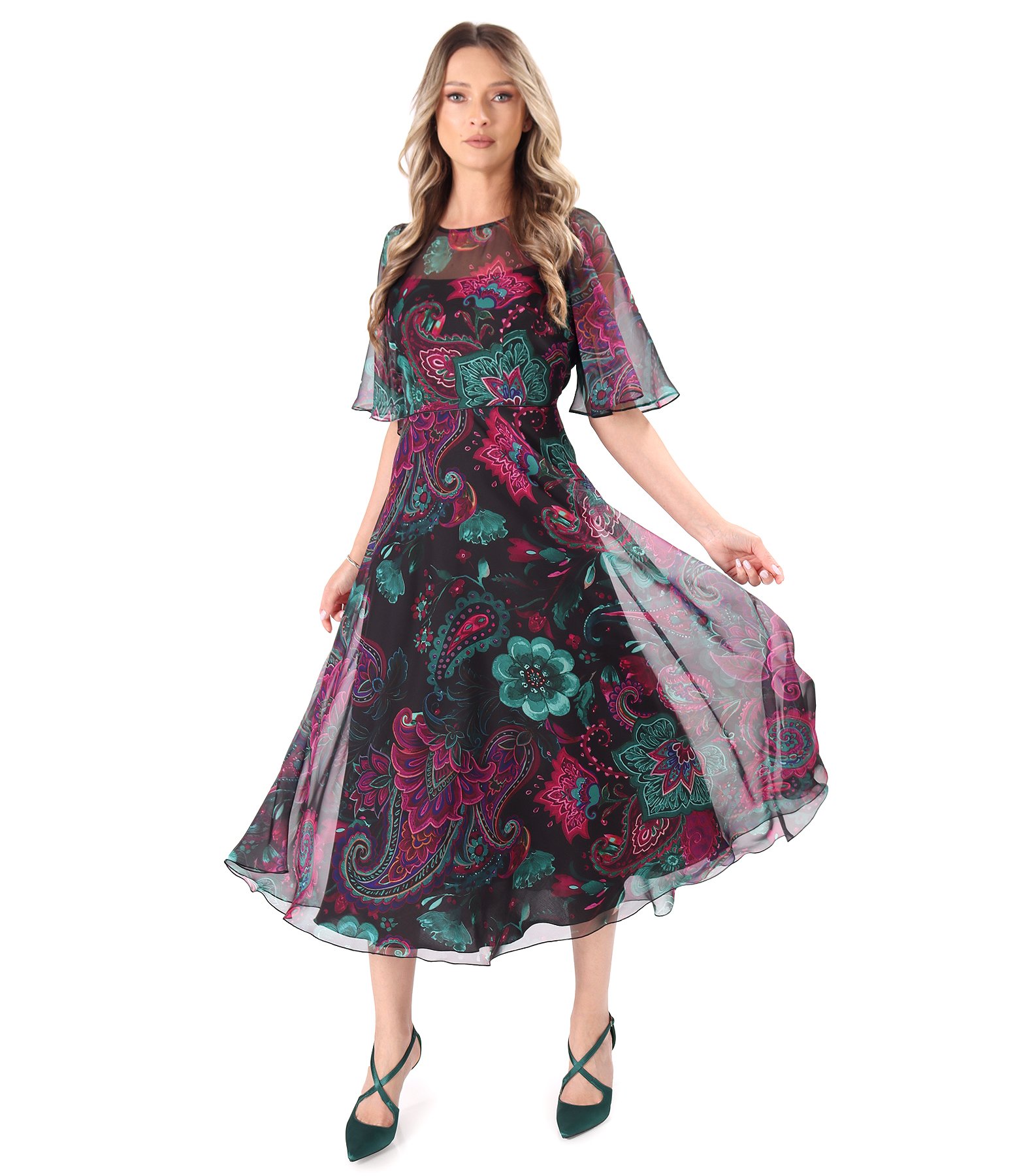 Rochie midi din voal fin imprimat cu motive florale, cu maneci ample din voal, dublata cu viscoza, si cu decolteu rotund. Se inchide cu fermoar ascuns pe mijloc spate. Pozitia imprimeului variaza per produs.
