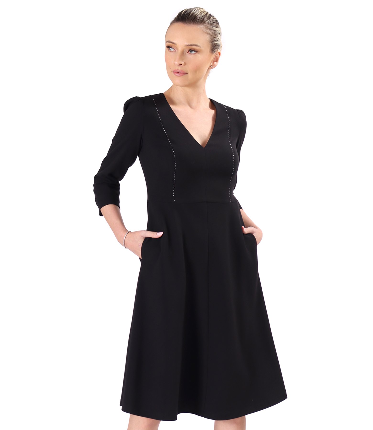 Rochie office clos din stofa elastica cu viscoza, cu maneci 3/4, buzunare laterale si decolteu adanc in V. Rochia are cusaturi decorative in contrast pe fata. Se inchide cu fermoar ascuns pe mijloc spate.