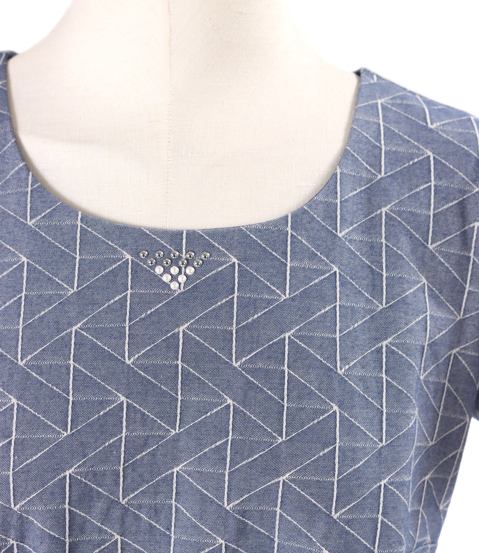 Rochie office din bumbac elastic tip denim, maneci scurte si decolteu rotund cu aplicatie decorativa. Tesatura nu necesita calcare si nu se sifoneaza la purtare. Rochia este necaptusita si se inchide cu fermoar ascuns pe mijloc spate.