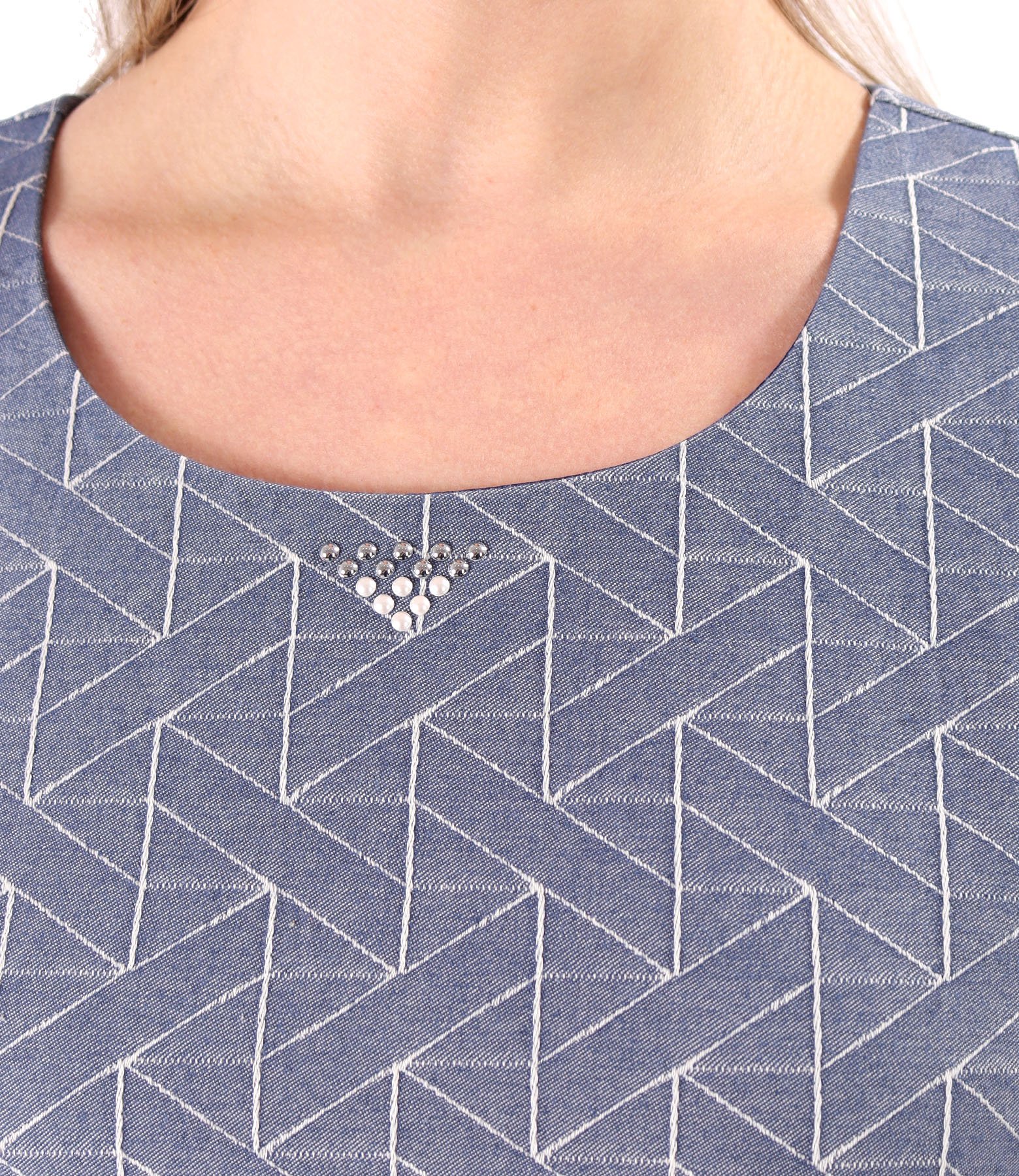 Rochie office din bumbac elastic tip denim, maneci scurte si decolteu rotund decorat cu cristale Swarovki®. Tesatura nu necesita calcare si nu se sifoneaza la purtare. Rochia este necaptusita si se inchide cu fermoar ascuns pe mijloc spate.
