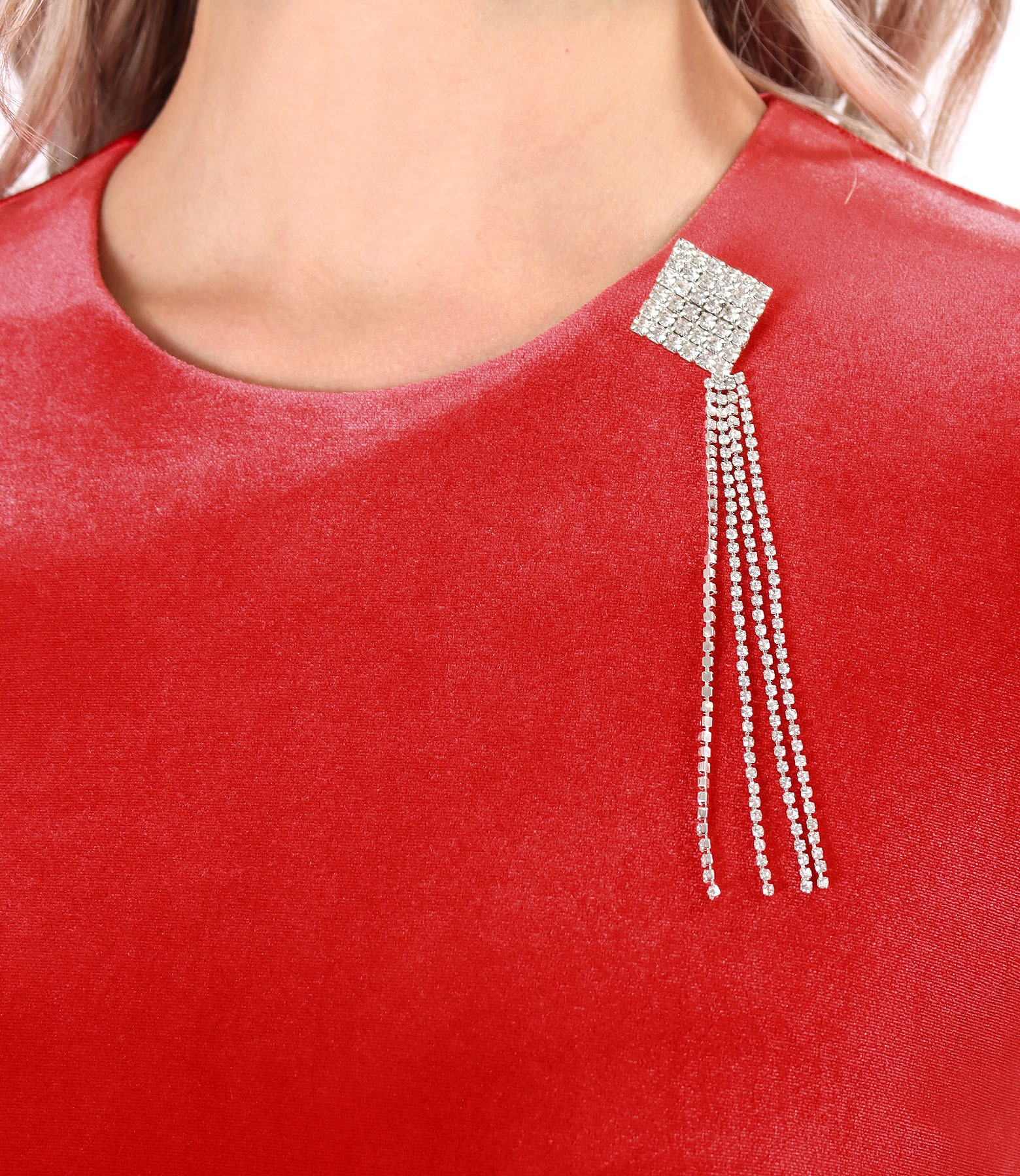 Ruffled dress in elastic velvet with long sleeves and round neckline. It closes with a hidden zipper in the middle of the back.