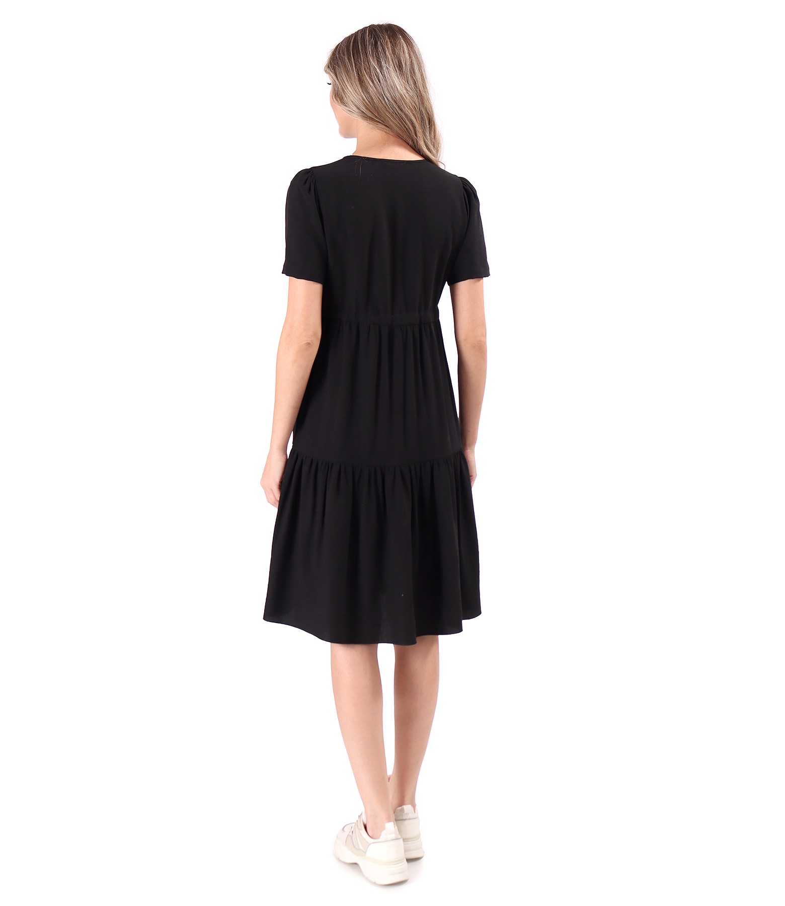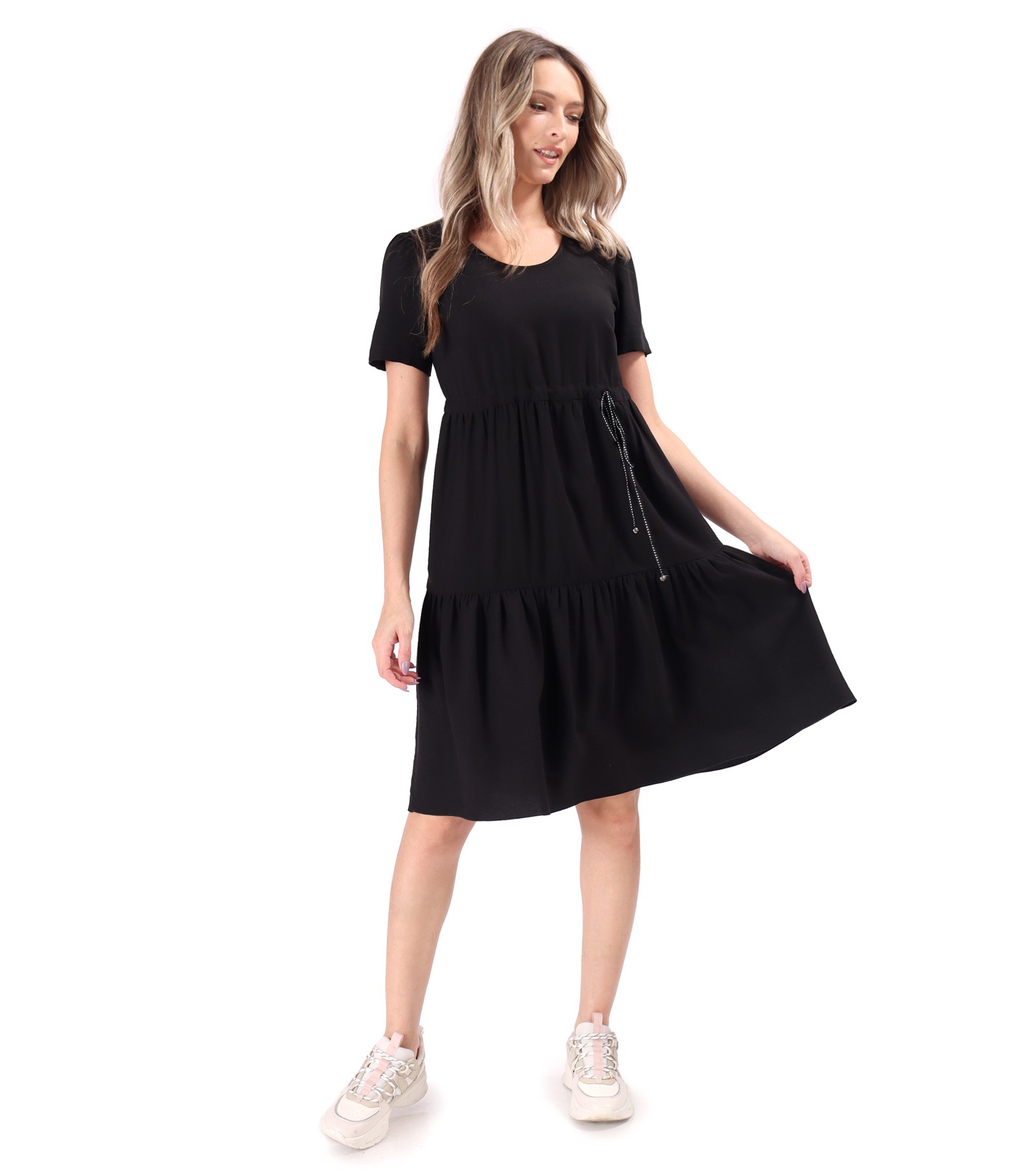 Viscose ruffled dress, with short sleeves, round neckline, gathered with a drawstring waist.