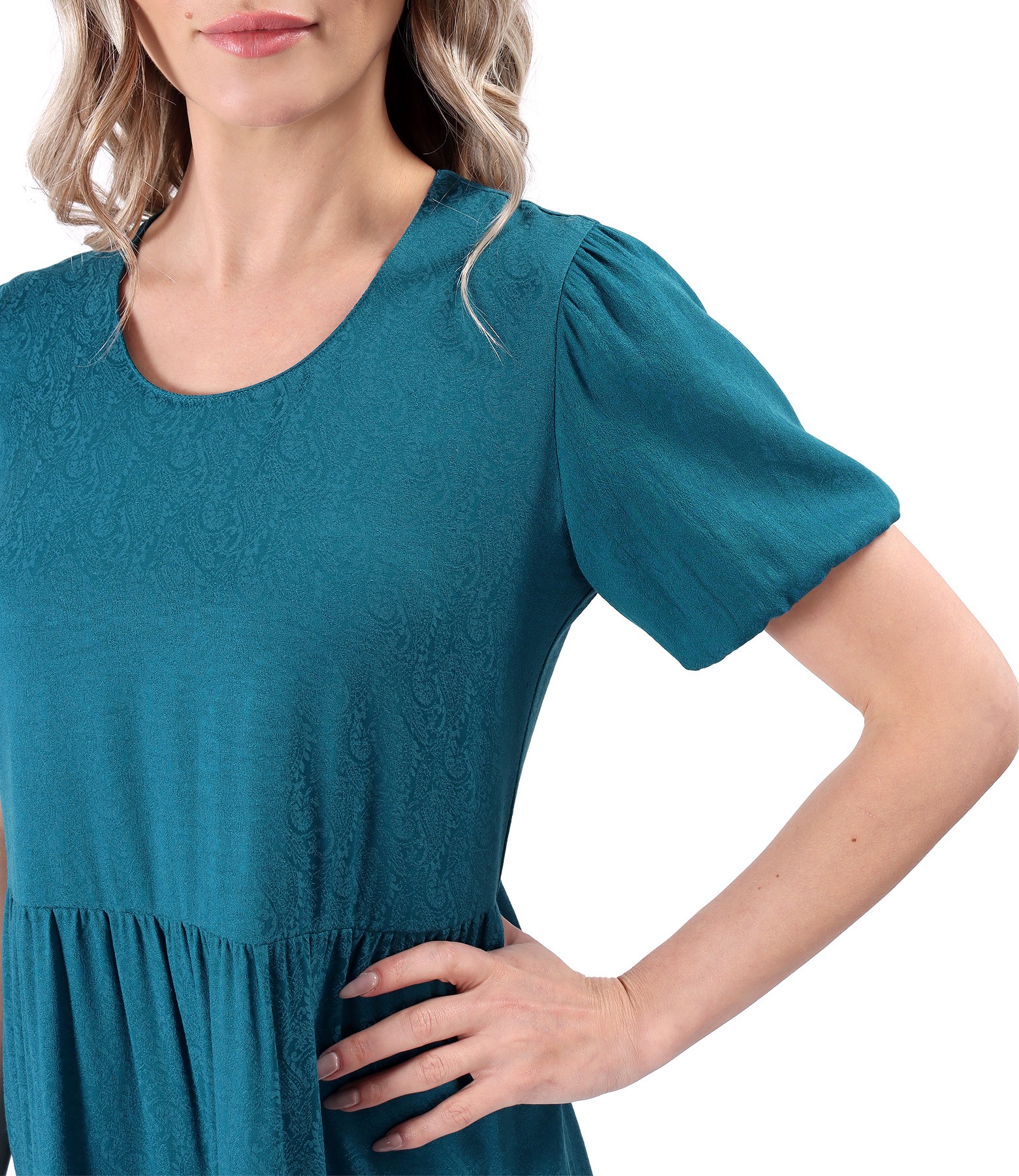 Ruffled viscose dress with tone-on-tone woven paisley motifs, round neckline, and short sleeves doubled with viscose.