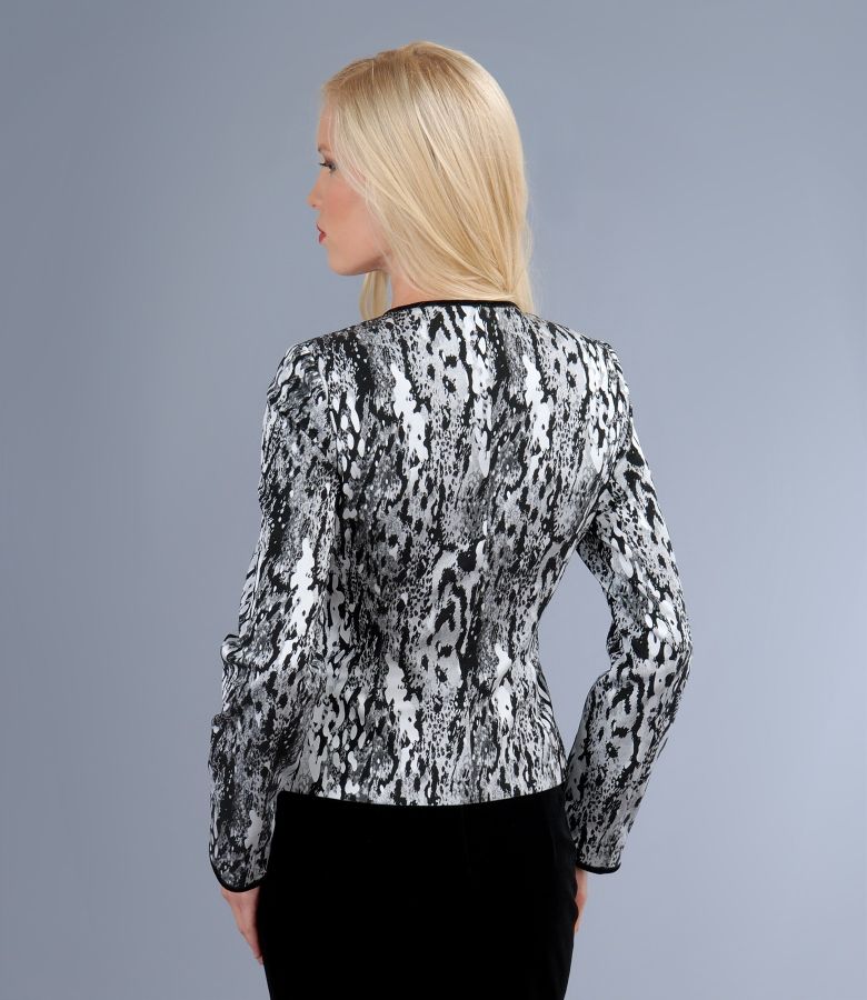 Casual jacket from elastic brocade fabric, without collar and lapels, with velvet trim applied on neckline and on sleeve termination. Closes on front with 9 hooks up to the base of the neckline.