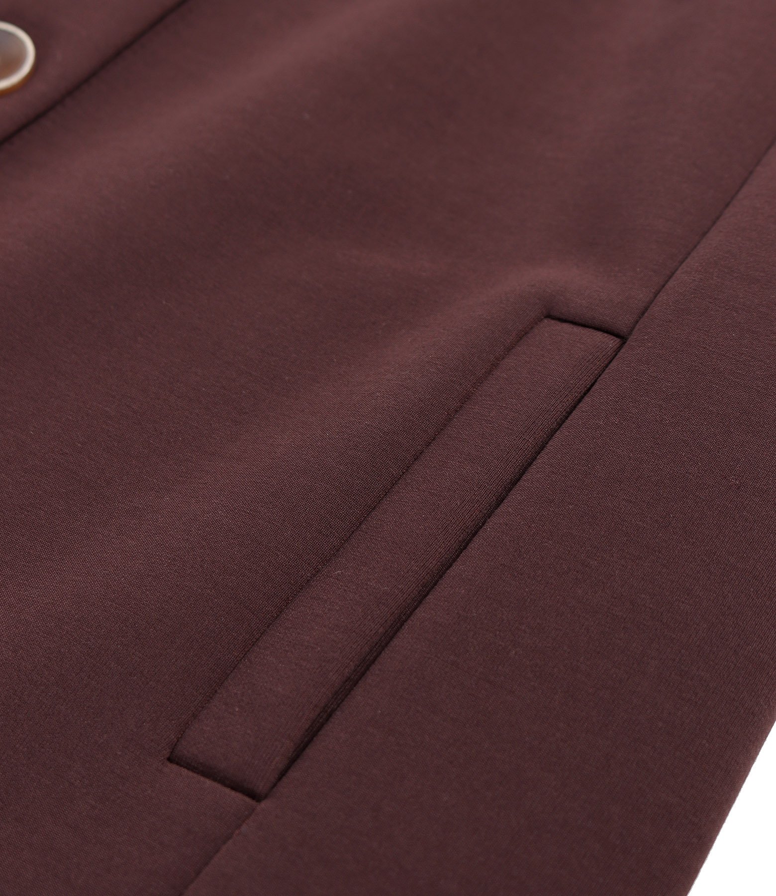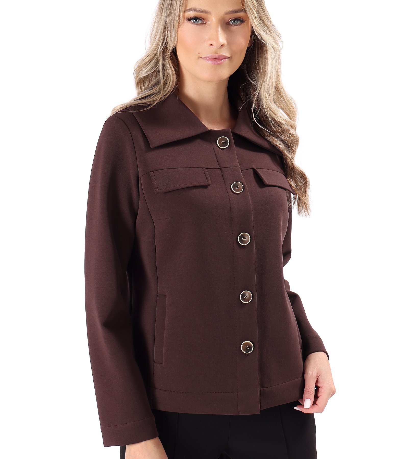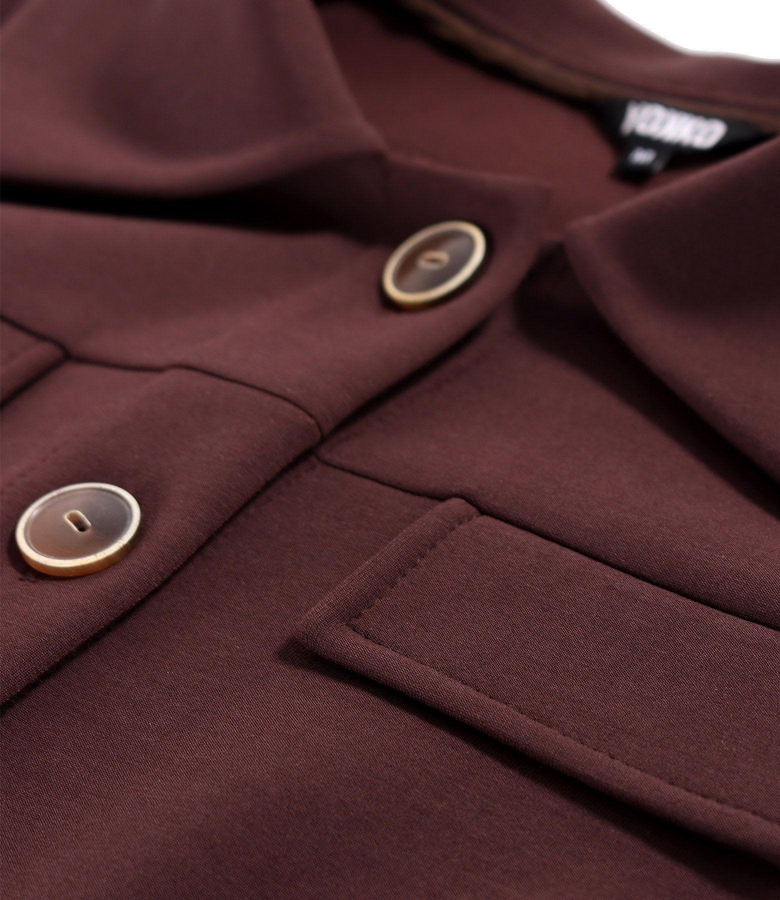 Sacou din stofa elastica cu bumbac, cu buzunare laterale, clape decorative pe fata si guler ascutit. Se inchide cu 5 nasturi pe mijloc fata.