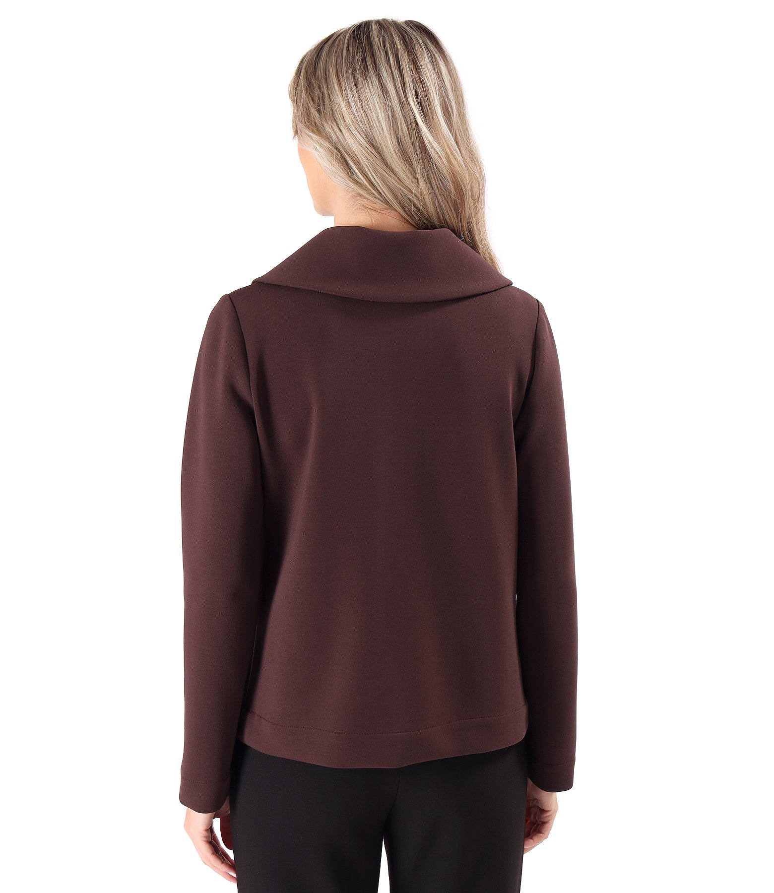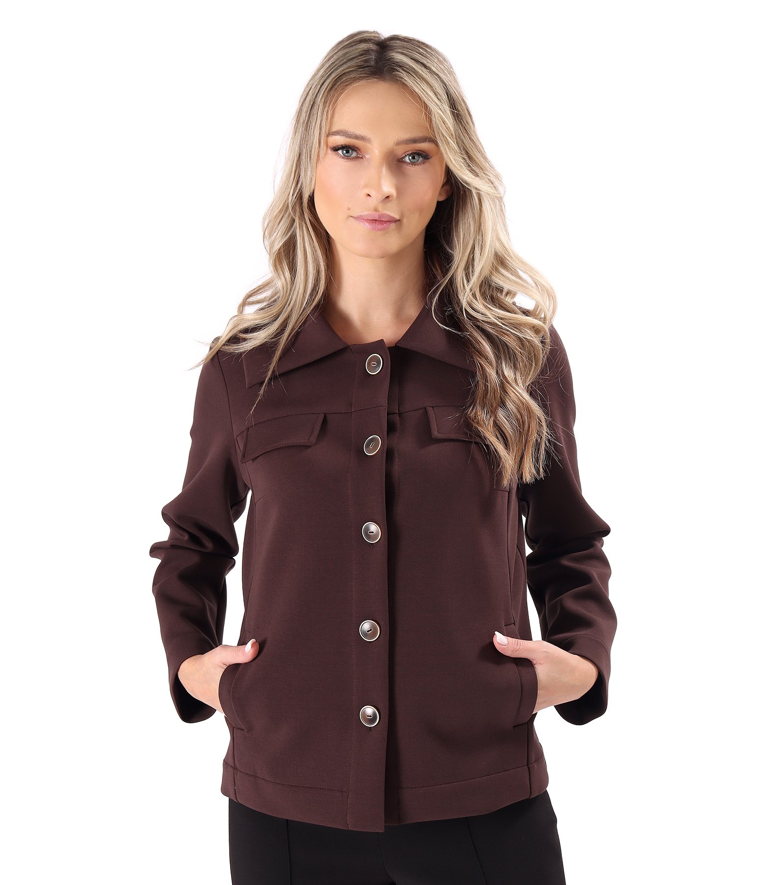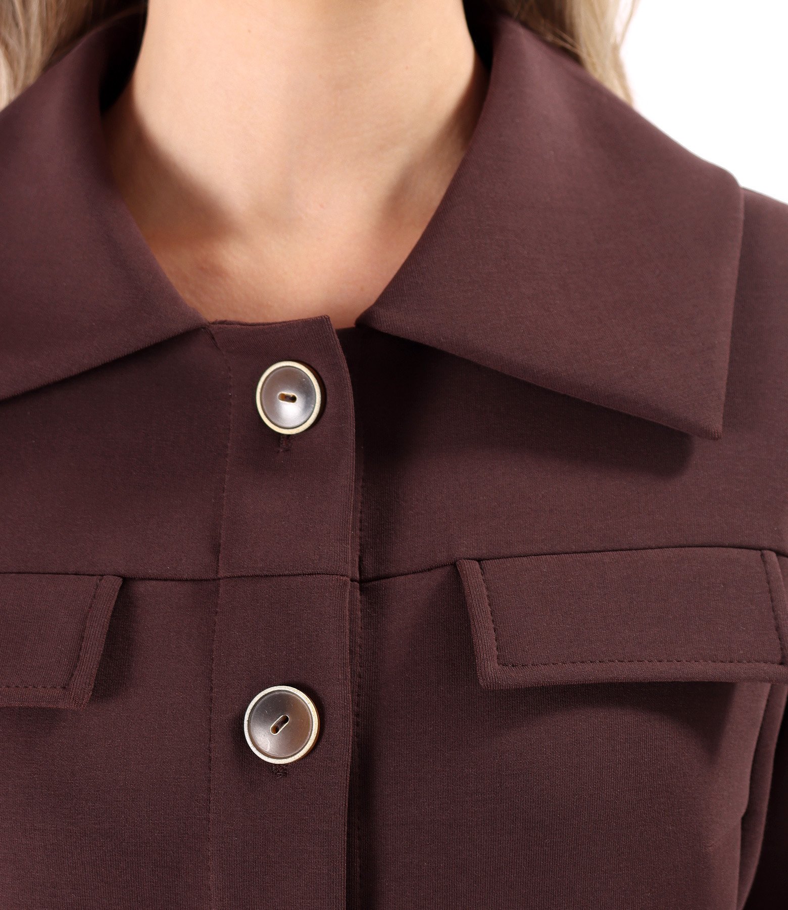 Sacou din stofa elastica cu bumbac, cu buzunare laterale, clape decorative pe fata si guler ascutit. Se inchide cu 5 nasturi pe mijloc fata.
