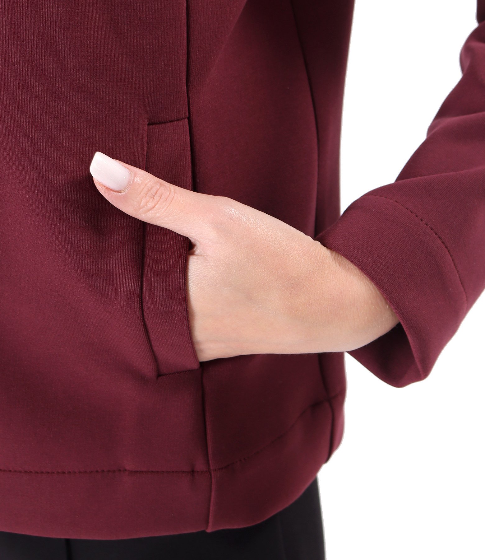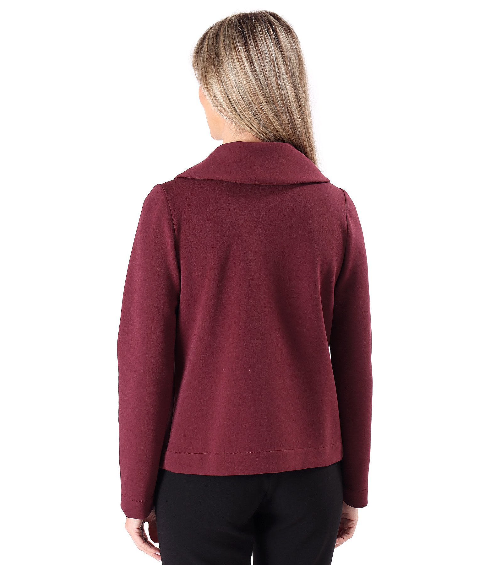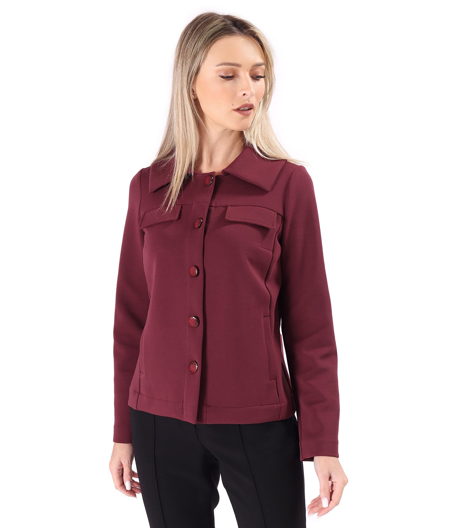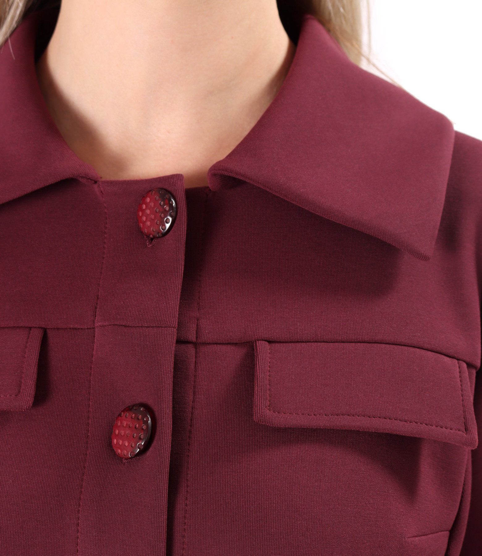Sacou din stofa elastica cu bumbac, cu buzunare laterale, clape decorative pe fata si guler ascutit. Se inchide cu 5 nasturi pe mijloc fata.