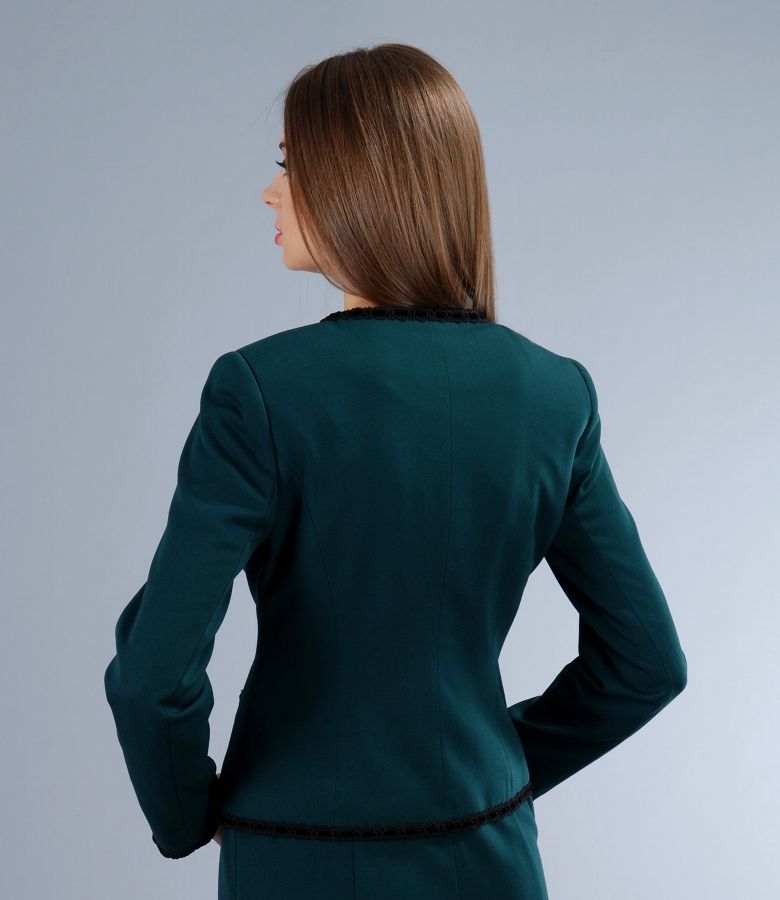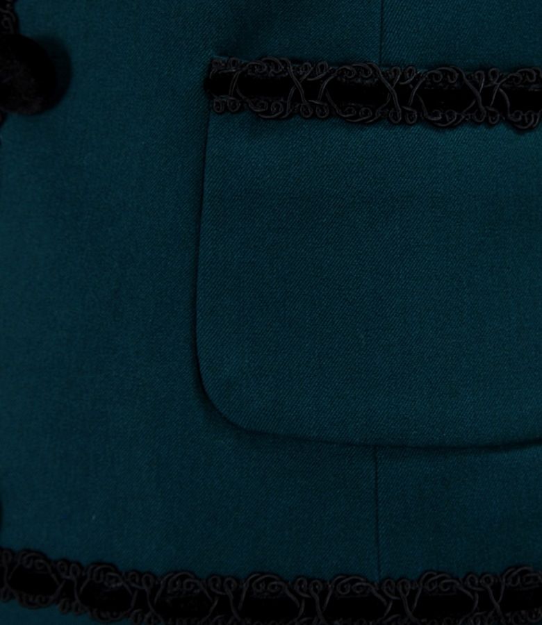 Jacket without collar and lapels, with velvet trim applied on neck-line, edge and termination. Closes on the front with 9 staples up to the base of the neck-line