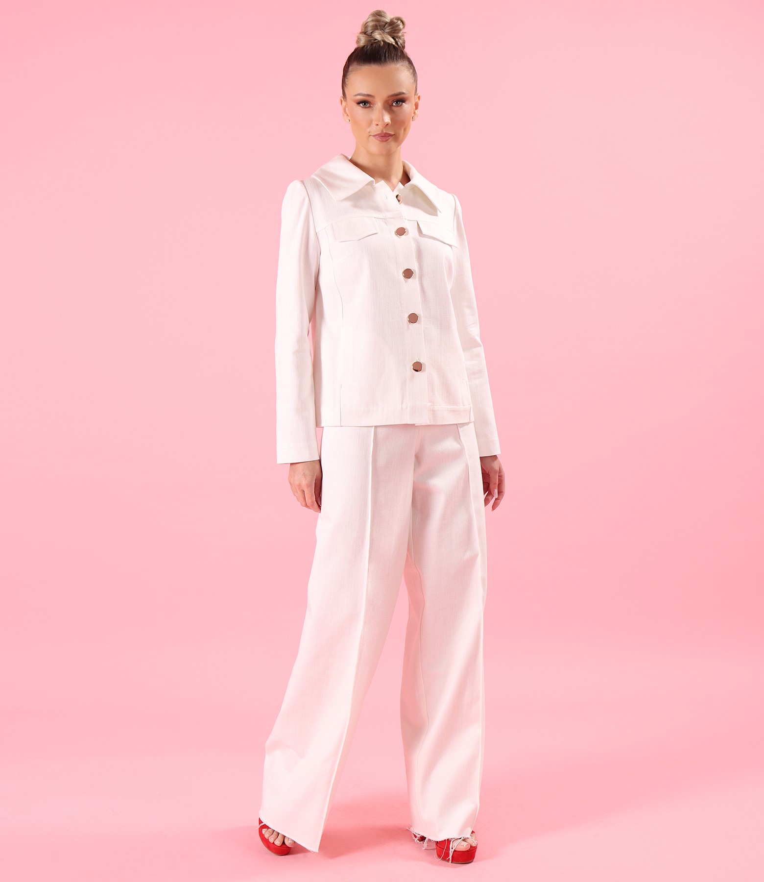 Sacou si pantaloni largi din bumbac tip denim alb-ecru (), size