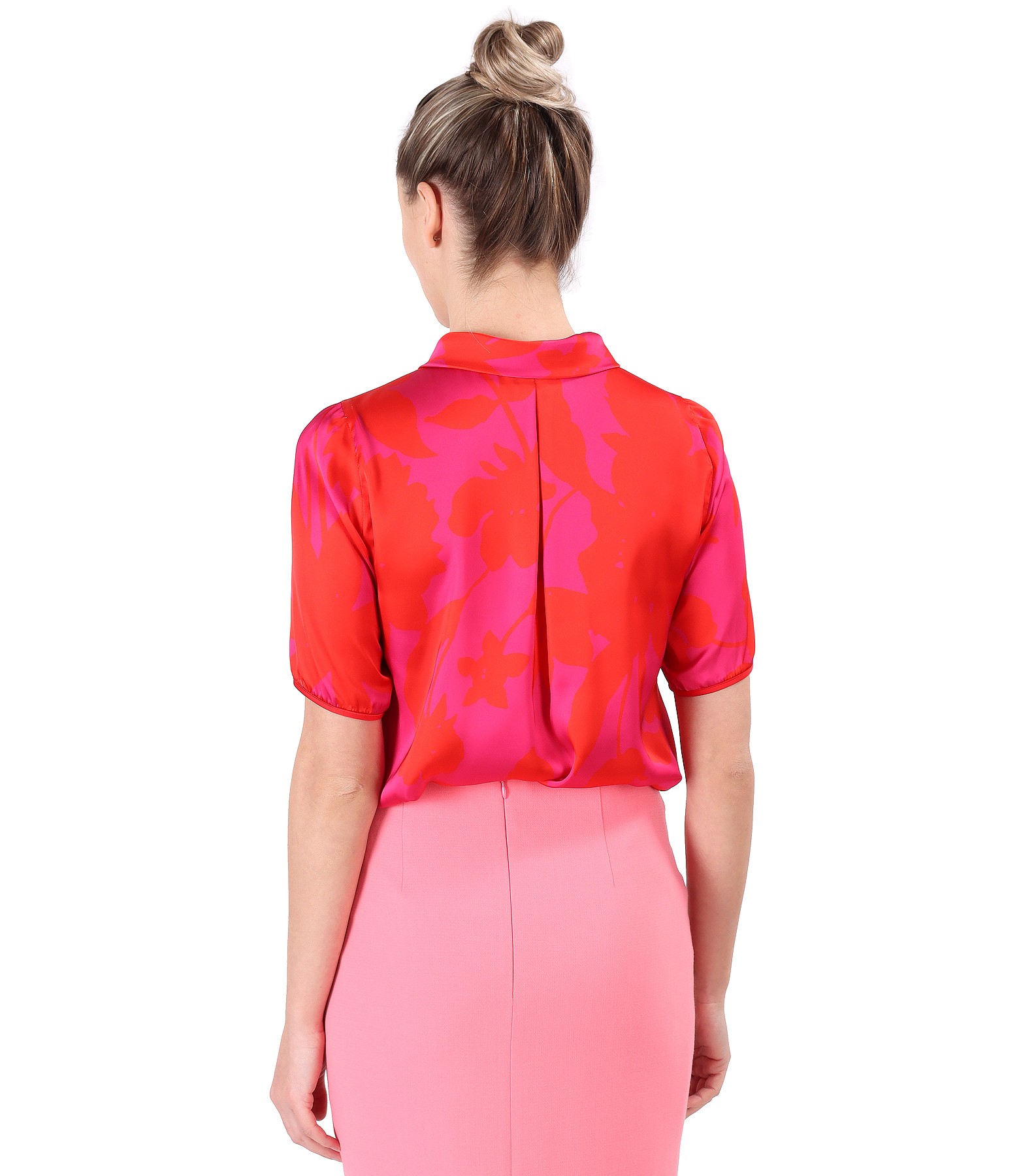 Elegant blouse, slightly satin, printed with floral motifs, short sleeves with elastic at the end, with a fold in the middle of the back and a round V decolletage closed on the front with an button.