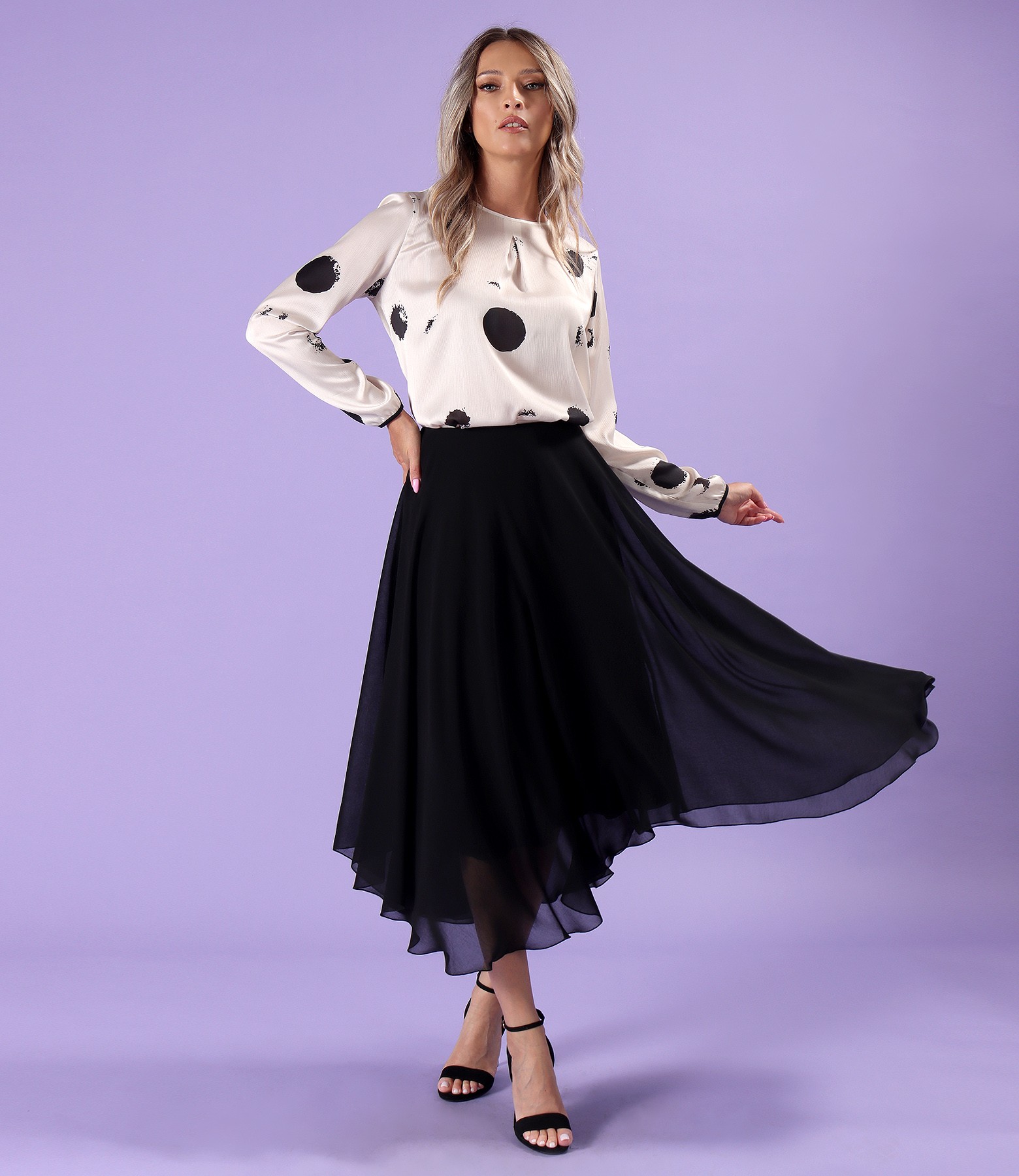 Satin blouse printed with geometric motifs, with long sleeves gathered at the end and a round neckline with a pleat in the middle of the front. It closes with a button on the middle back.