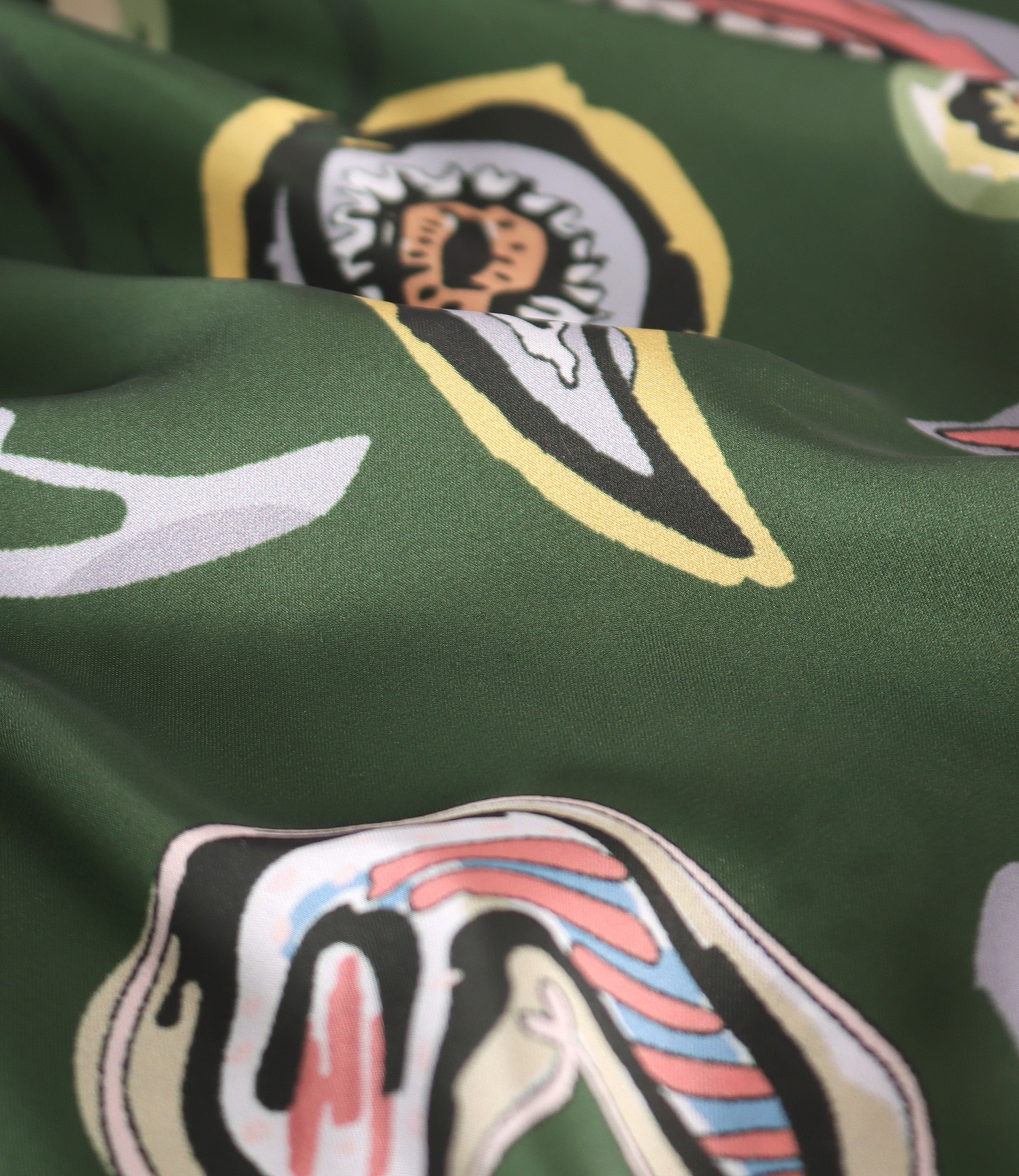 Satin blouse printed with paisley motifs, with long sleeves, and a round neckline. It closes with a button on the middle back.