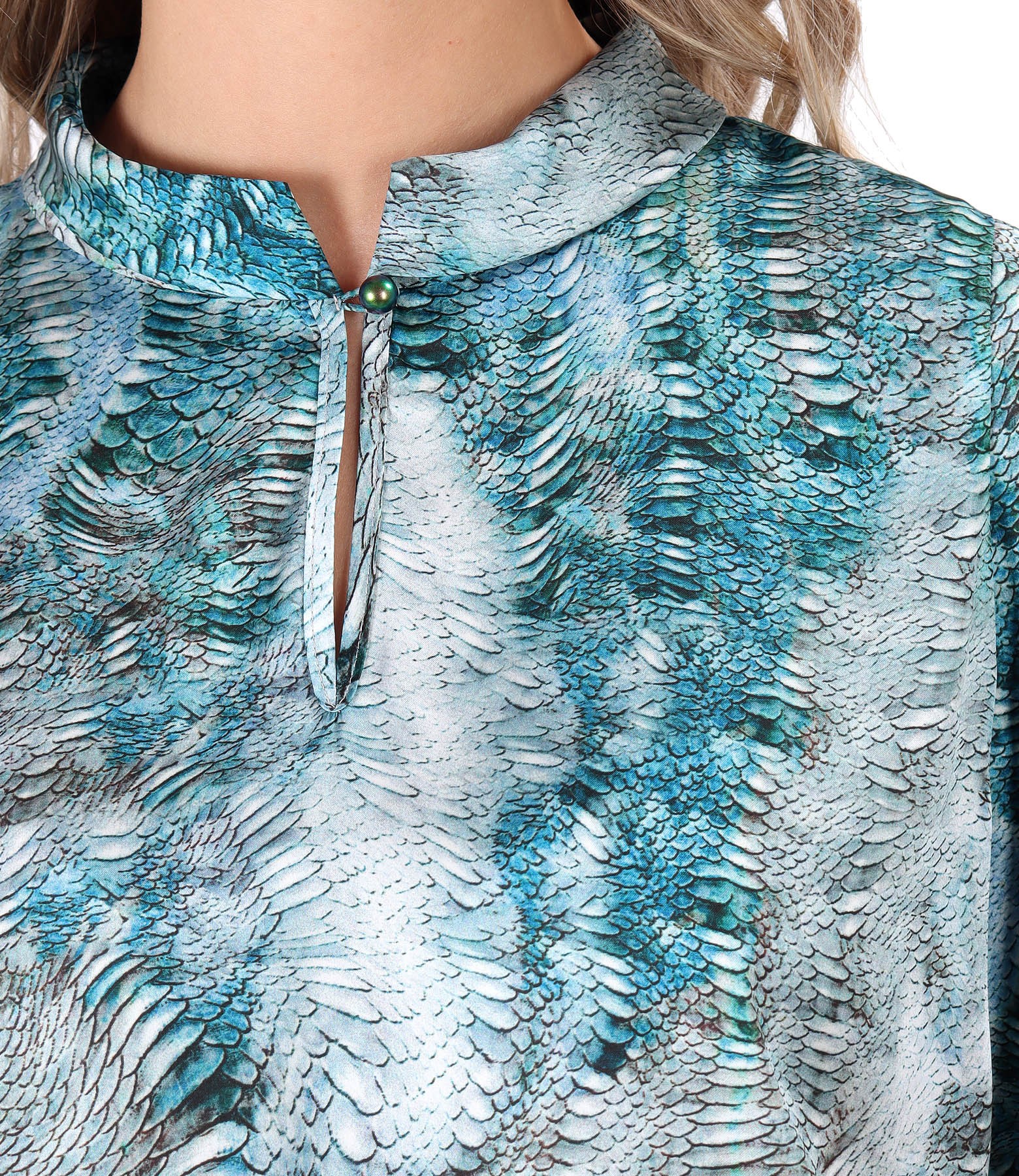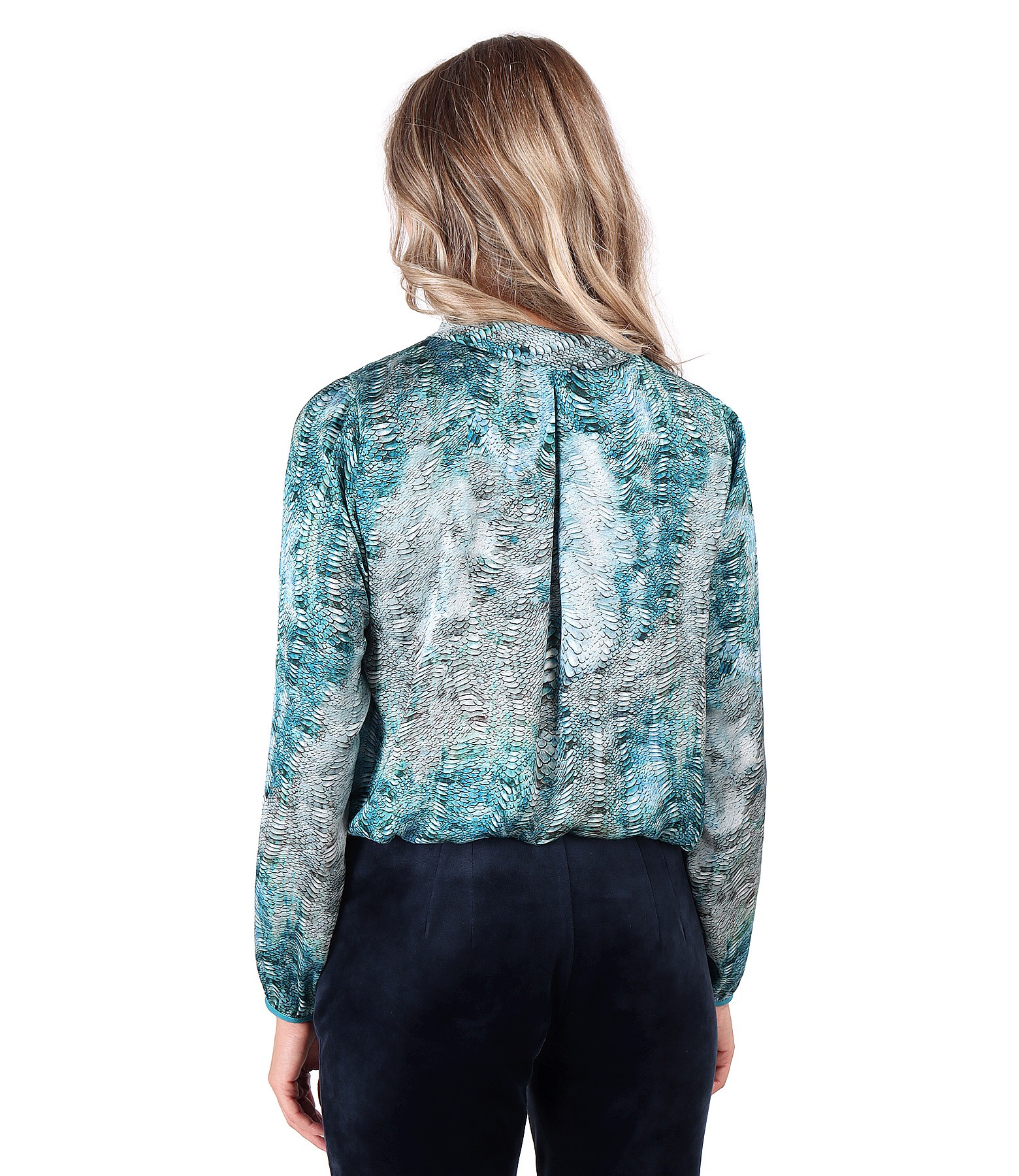 Elegant satin blouse with snake print motifs, long sleeves with elastic at the end, with a pleated middle back and a low-cut neck embellished with pearl.