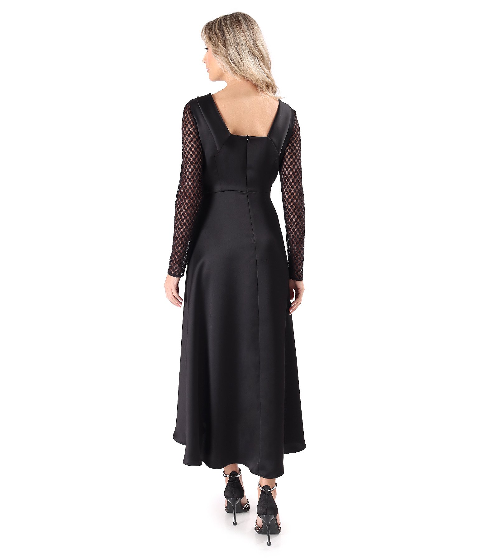 Satin midi dress with long lace sleeves, with elastic satin lined bust, round collar at front and square neckline at back. Concealed zipper closure at center back.